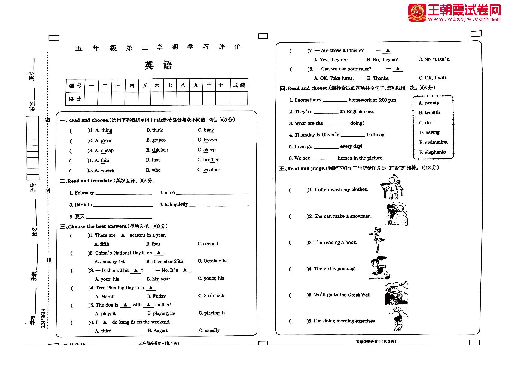 五年级英语人教PEP版(三起始)下册期末卷
