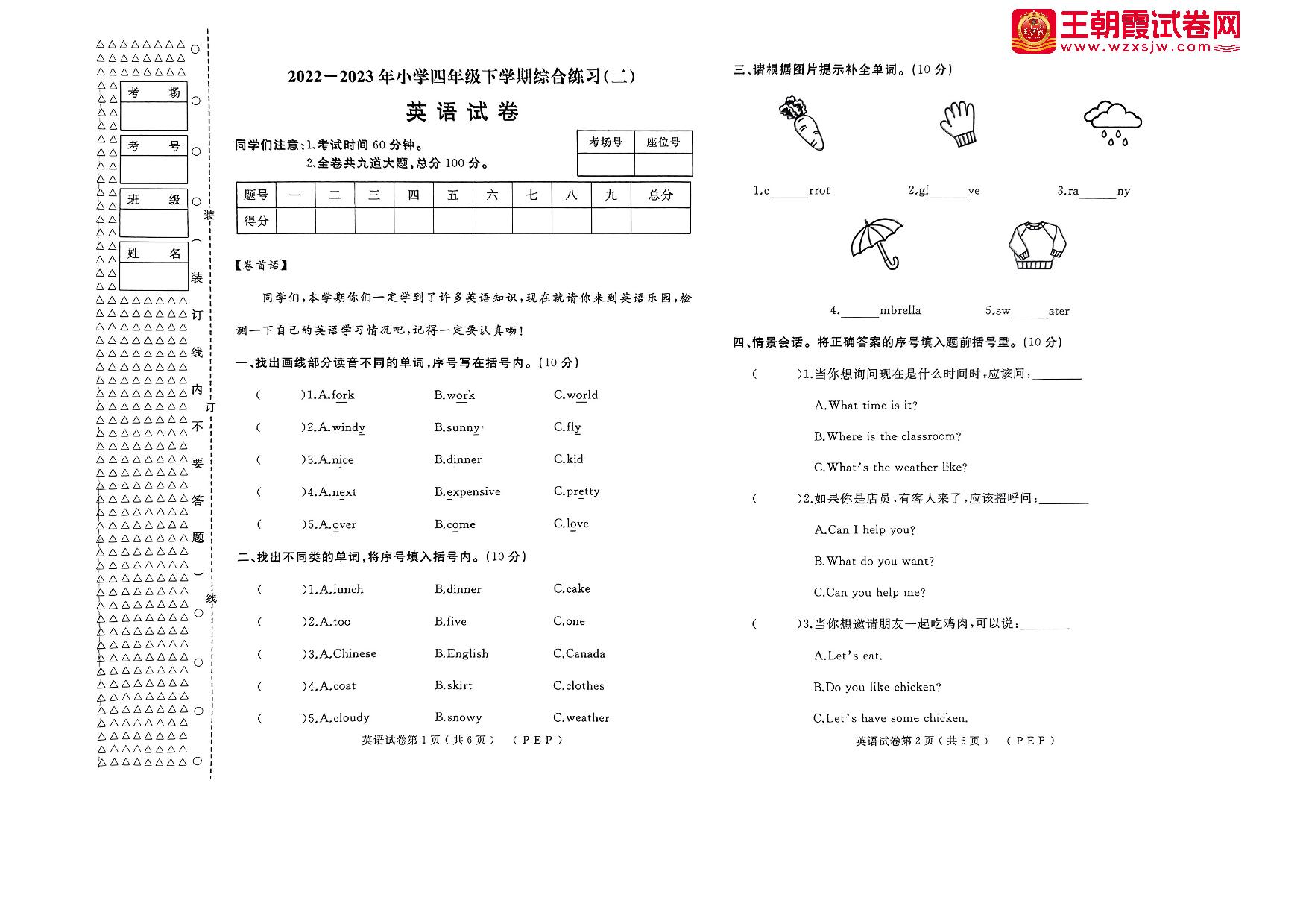 黑龙江省佳木斯市同江市东部六校联考2022-2023年下学期期末综合练习四年级英语(人教PEP版)