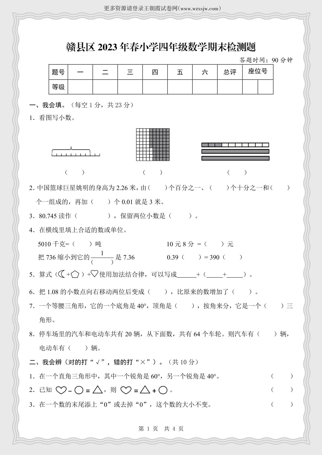 江西省赣州市赣县区2022-2023学年度第二学期期末检测题四年级数学(人教版)