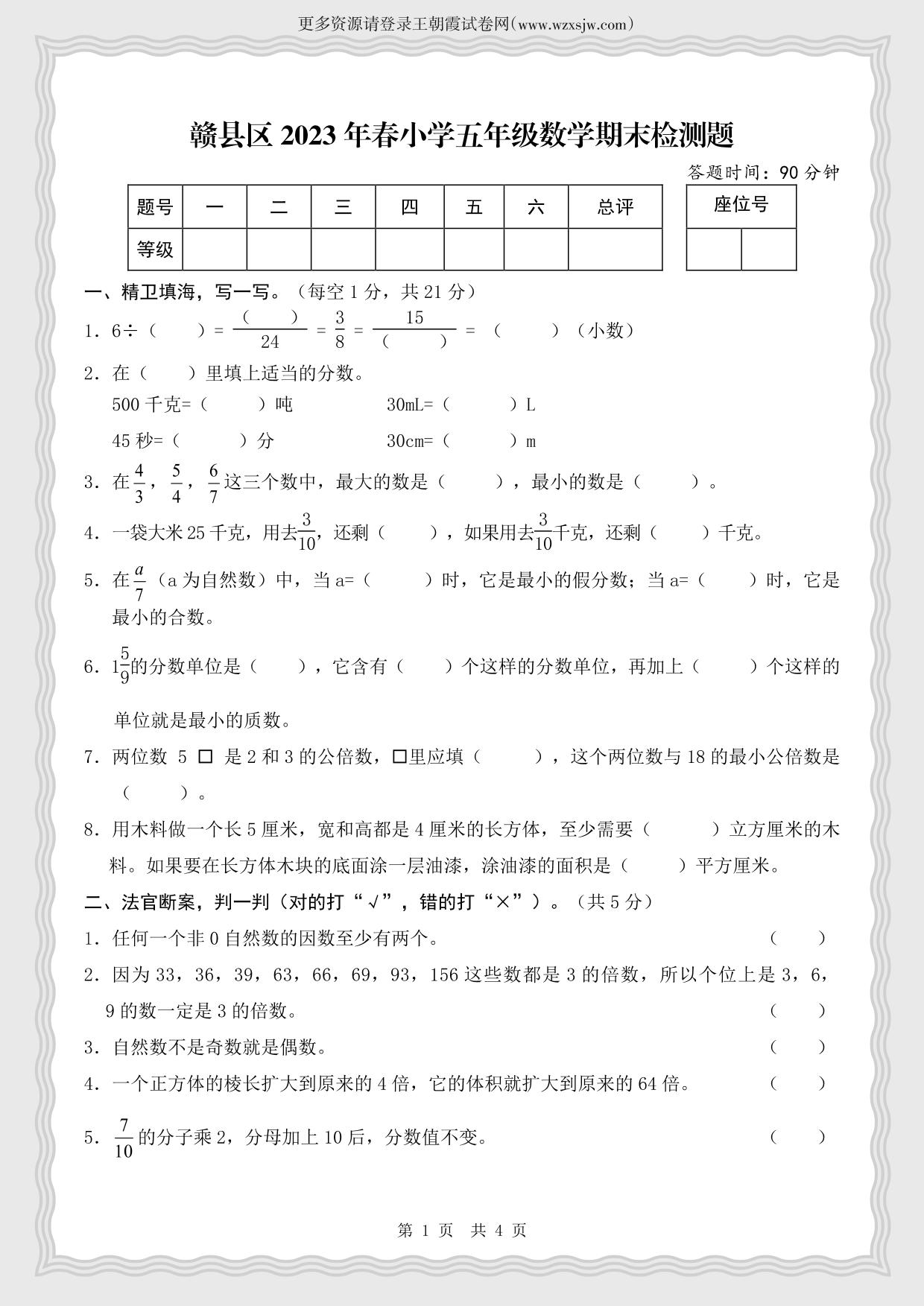 江西省赣州市赣县区2022-2023学年度第二学期期末检测题五年级数学(人教版)