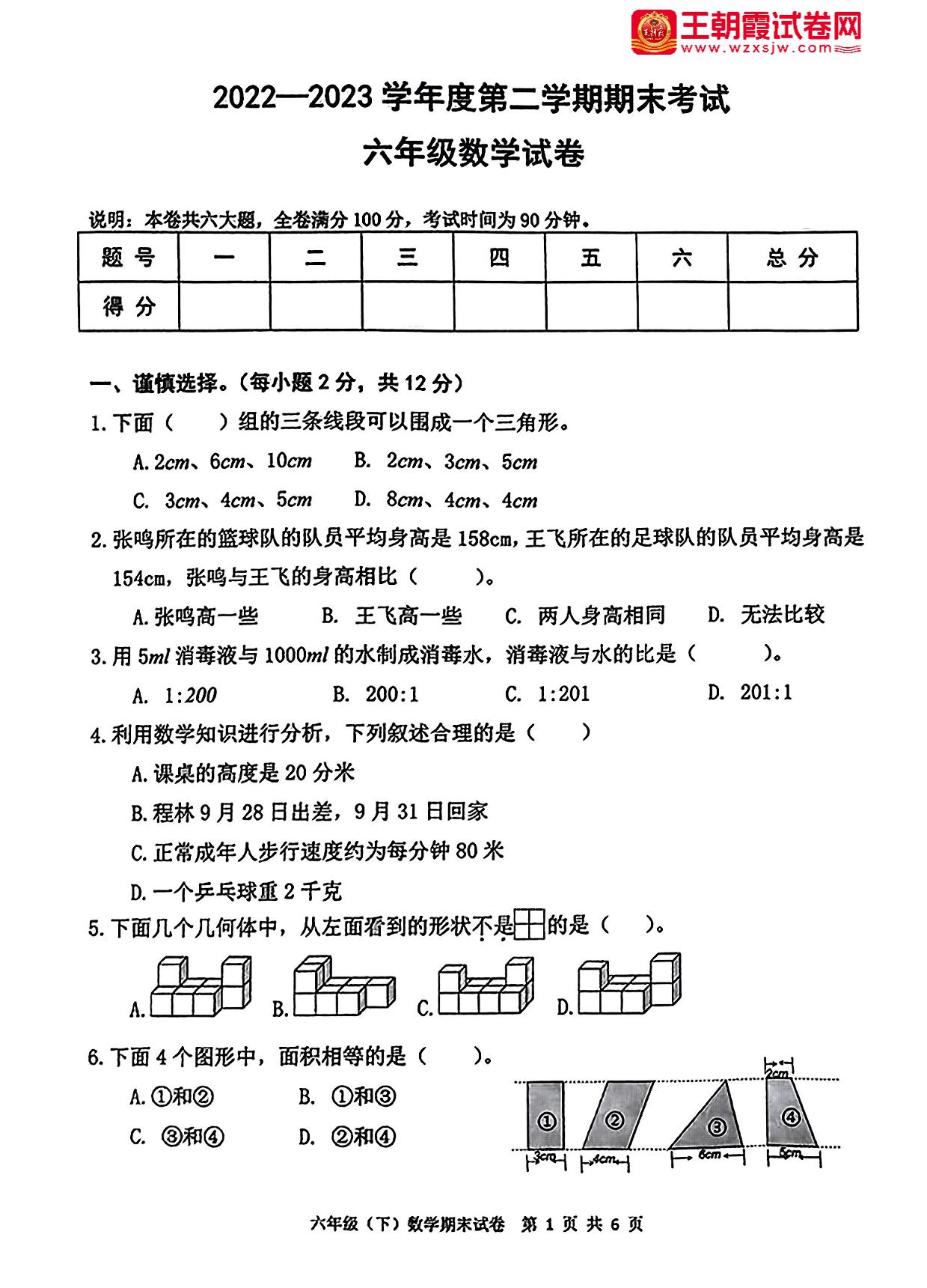 江西省宜春市袁州区2022-2023学年度第二学期期末考试试卷六年级数学(人教版)