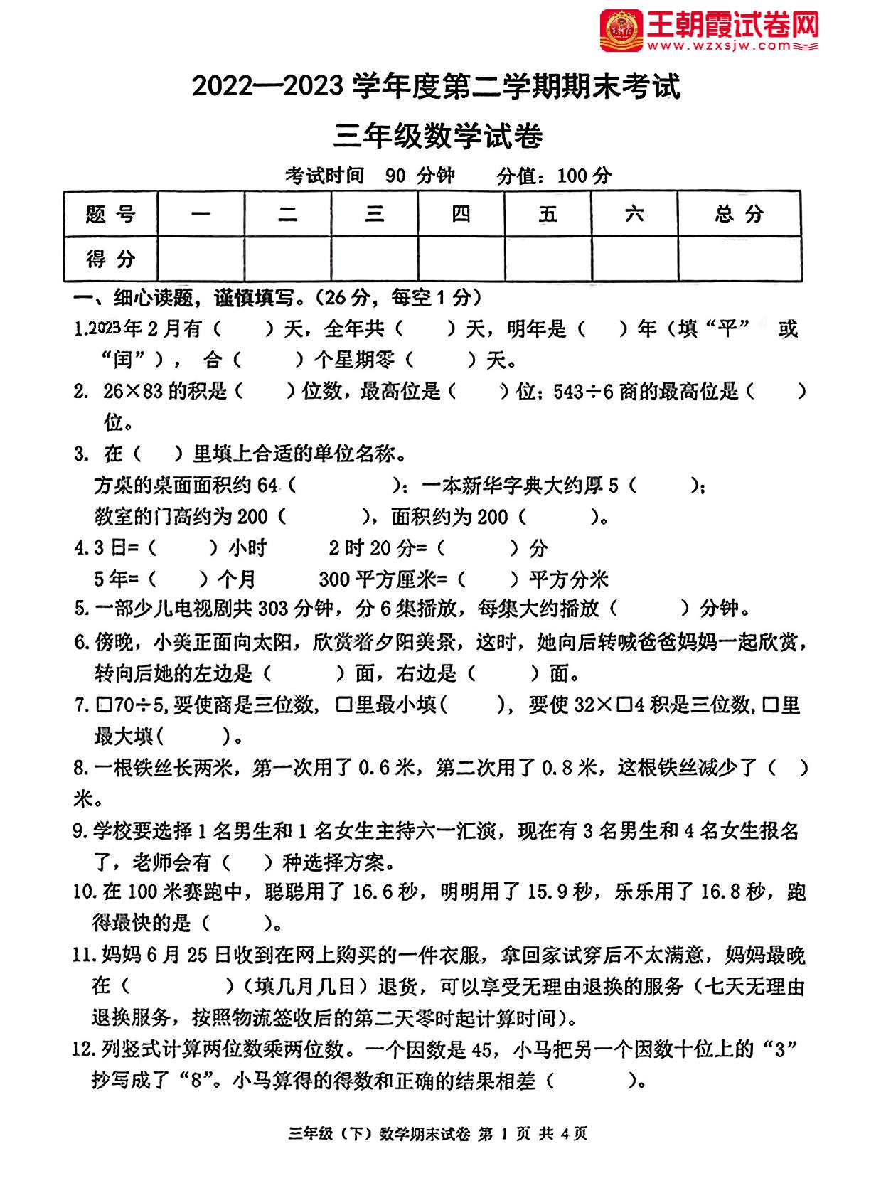 江西省宜春市袁州区2022-2023学年度第二学期期末考试试卷三年级数学(人教版)