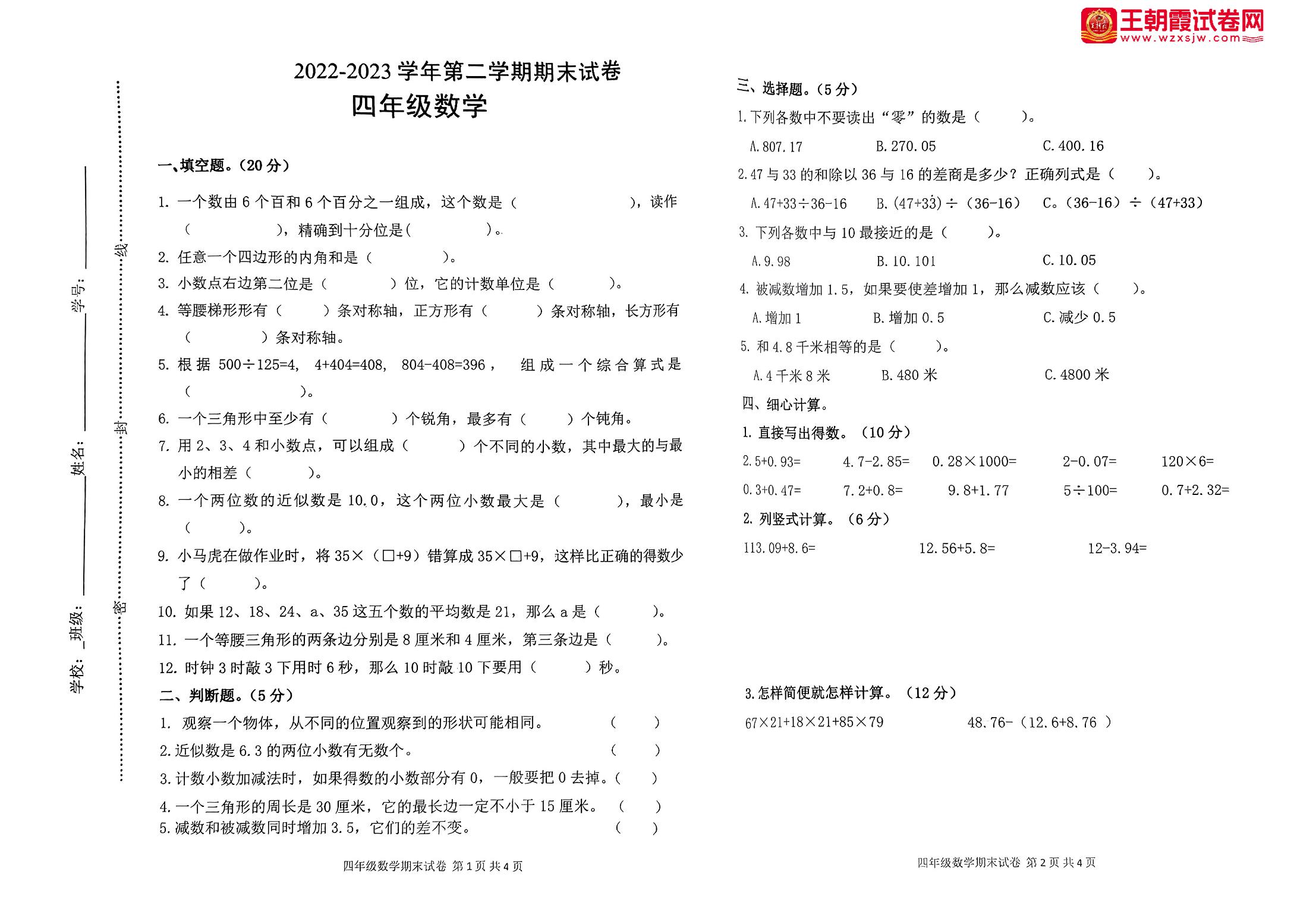 江西省宜春市丰城市2022-2023学年度第二学期期末试卷四年级数学(人教版)
