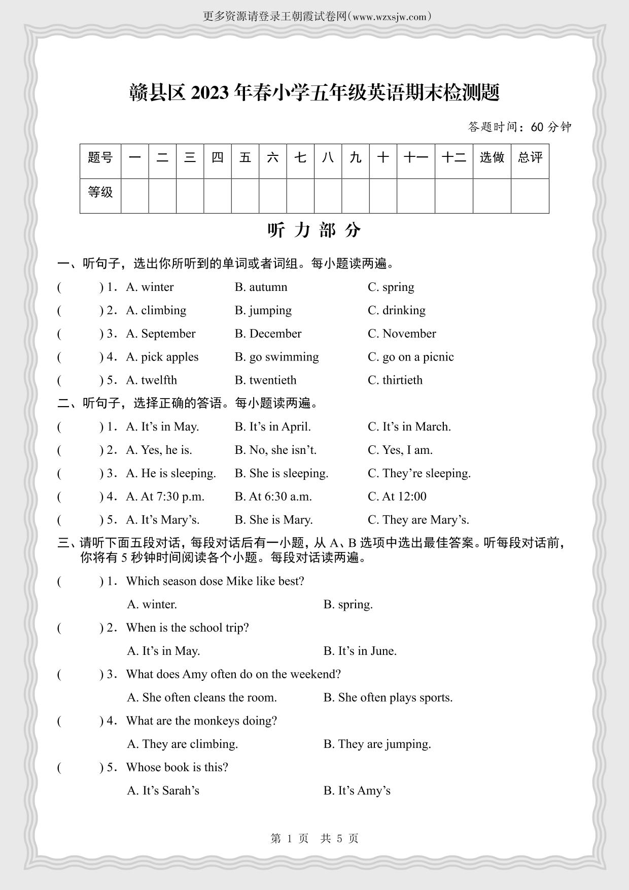江西省赣州市赣县区2022-2023学年度第二学期期末检测题五年级英语(人教PEP版)【无听力音频】