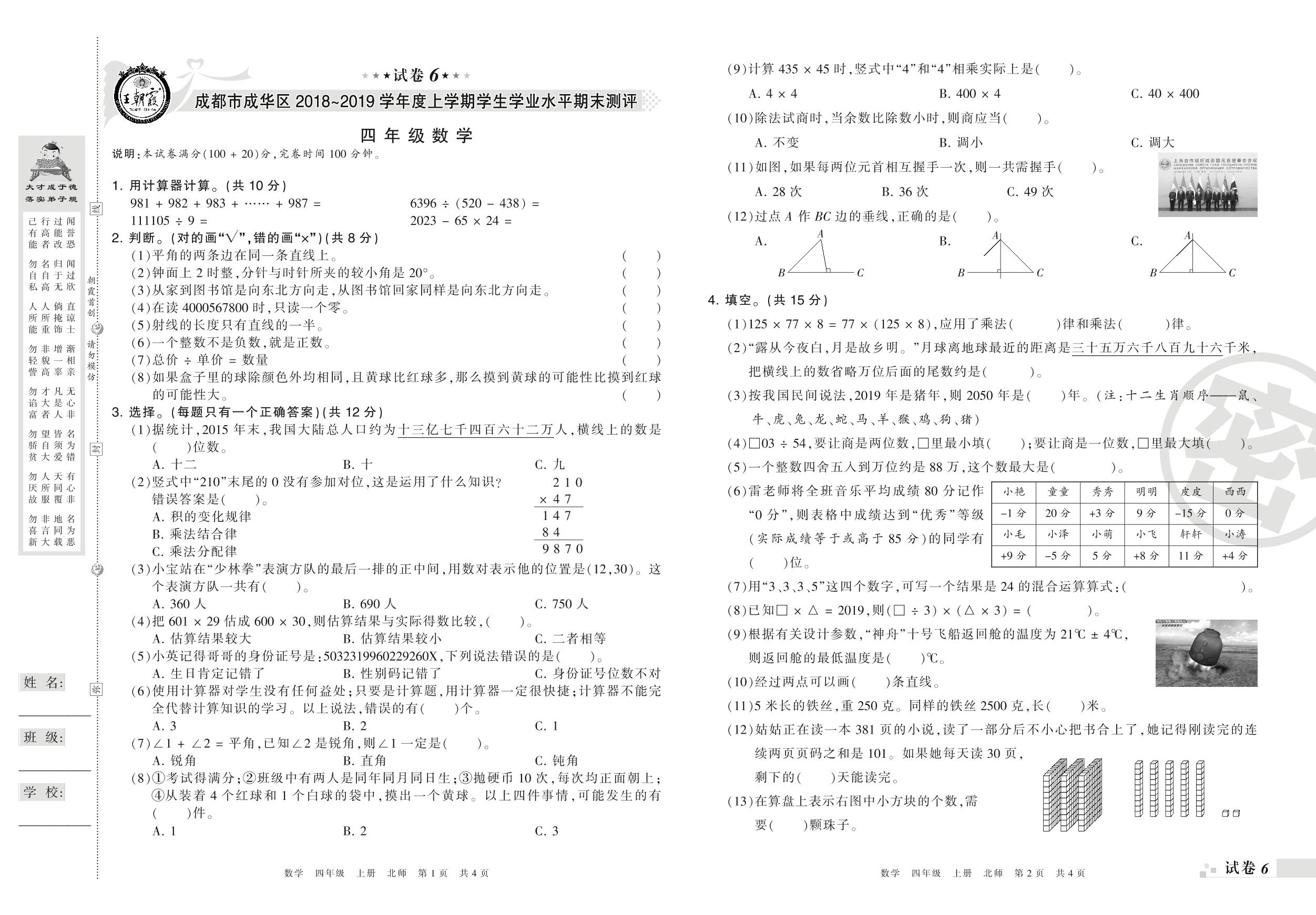 2018-2019学年第一学期成都市成华区四年级数学试卷(北师版)【6】