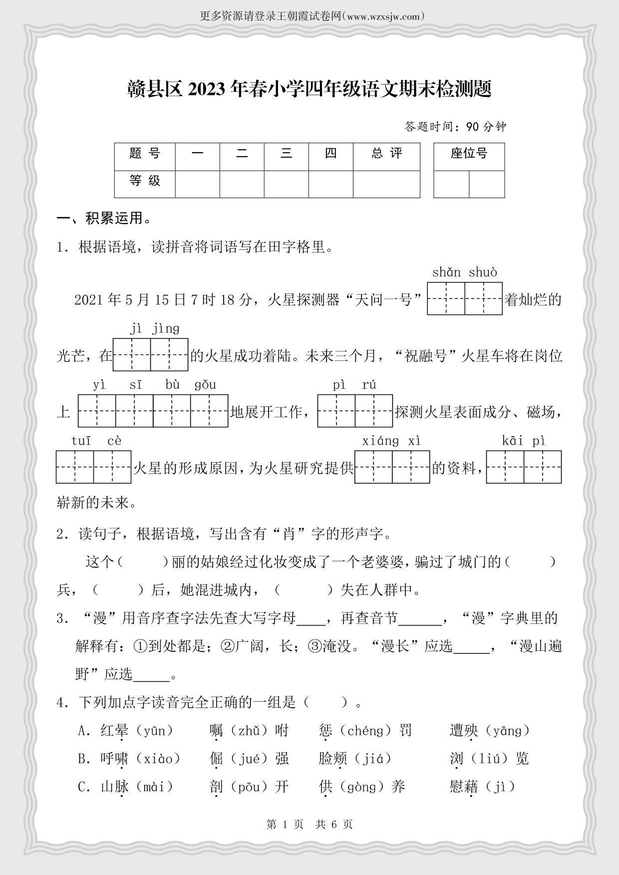 江西省赣州市赣县区2022-2023学年度第二学期期末检测题四年级语文(人教版)
