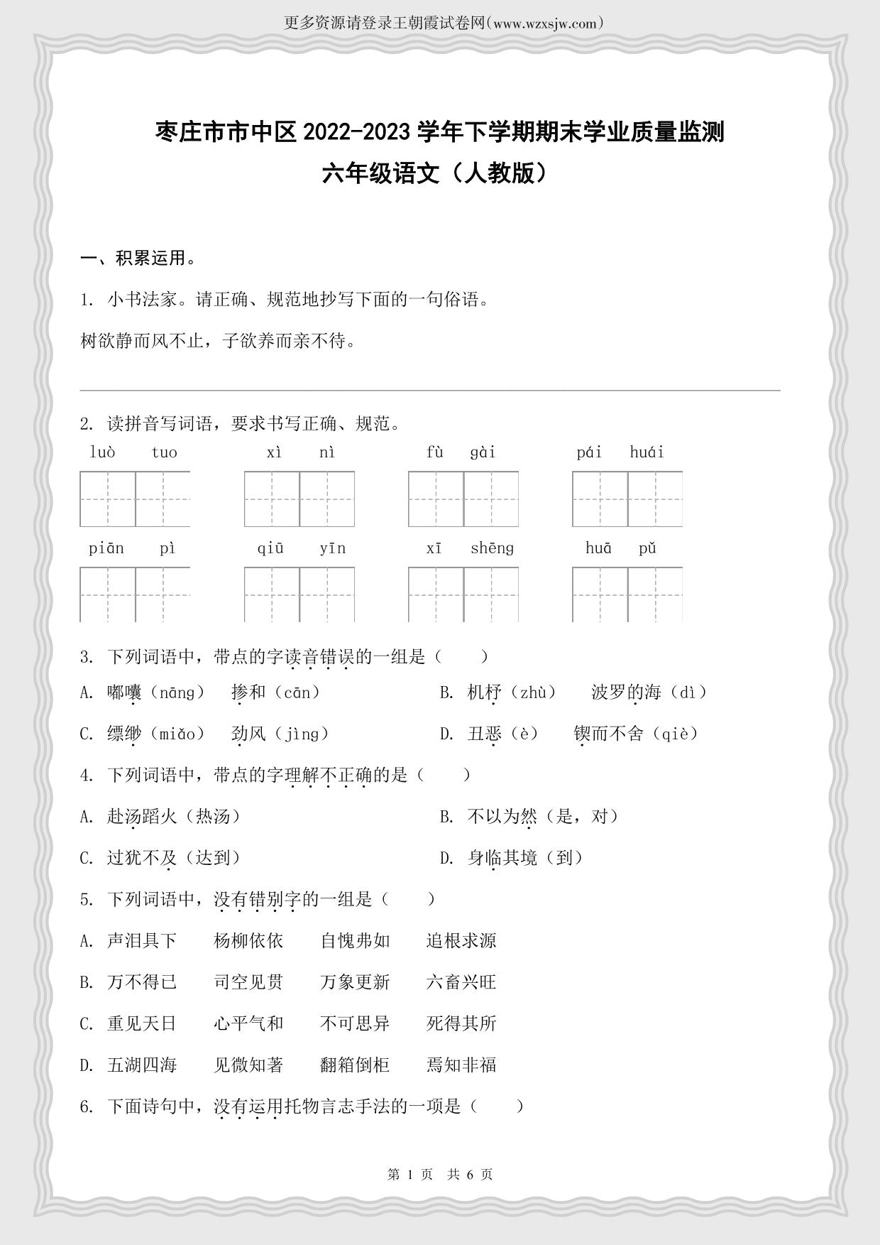 山东省枣庄市市中区2022-2023学年下学期期末学业质量监测六年级语文(人教版)