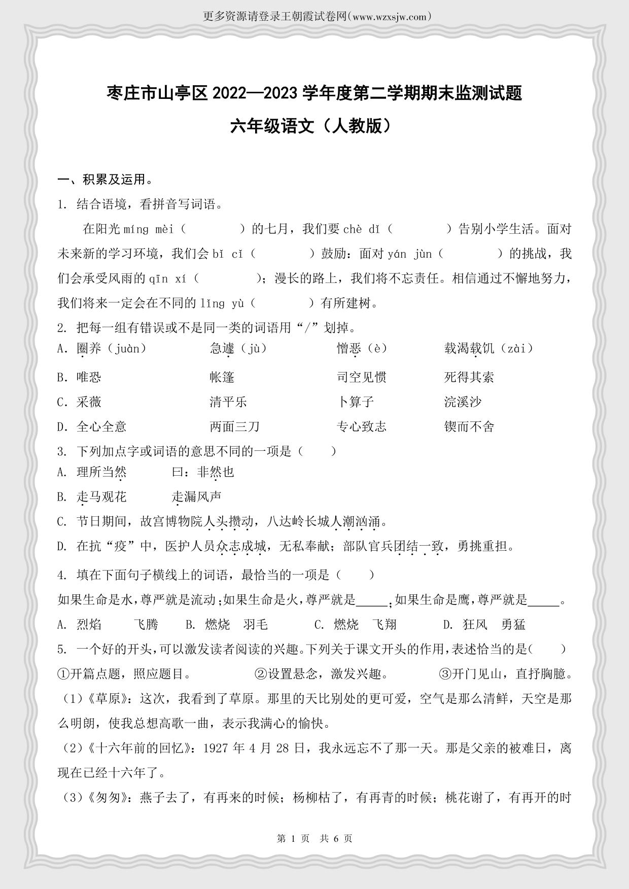 山东省枣庄市山亭区2022--2023学年度第二学期期末监测试题六年级语文(人教版)