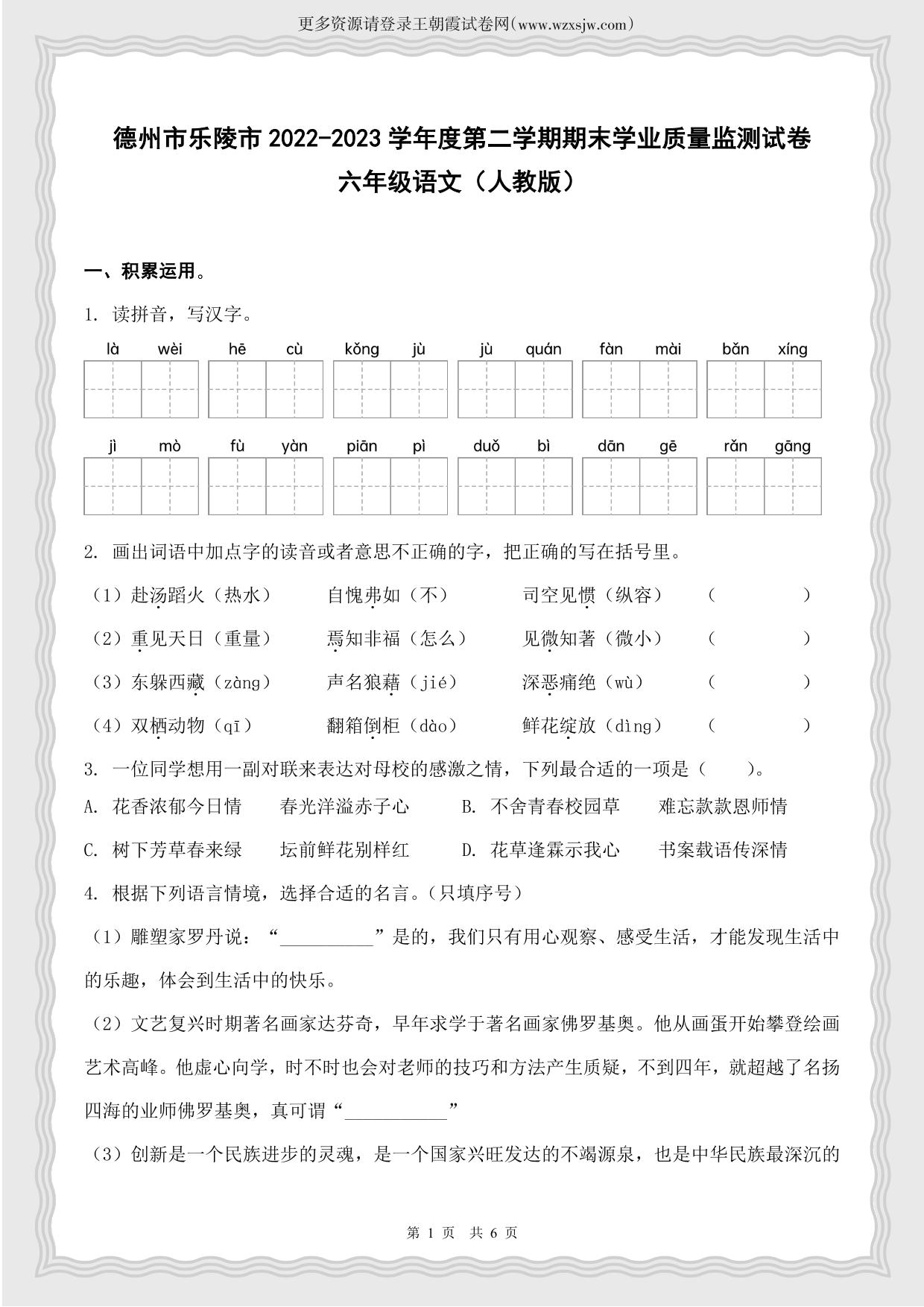 山东省德州市乐陵市2022-2023学年度第二学期期末学业质量监测试卷六年级语文(人教版)