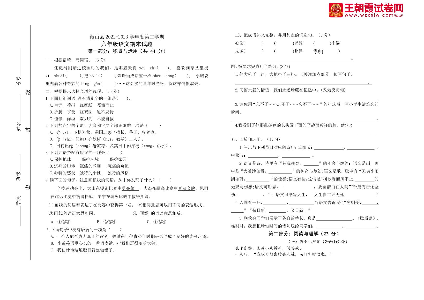 山东省济宁市微山县2022-2023年度第二学期期末试题六年级语文(人教版)