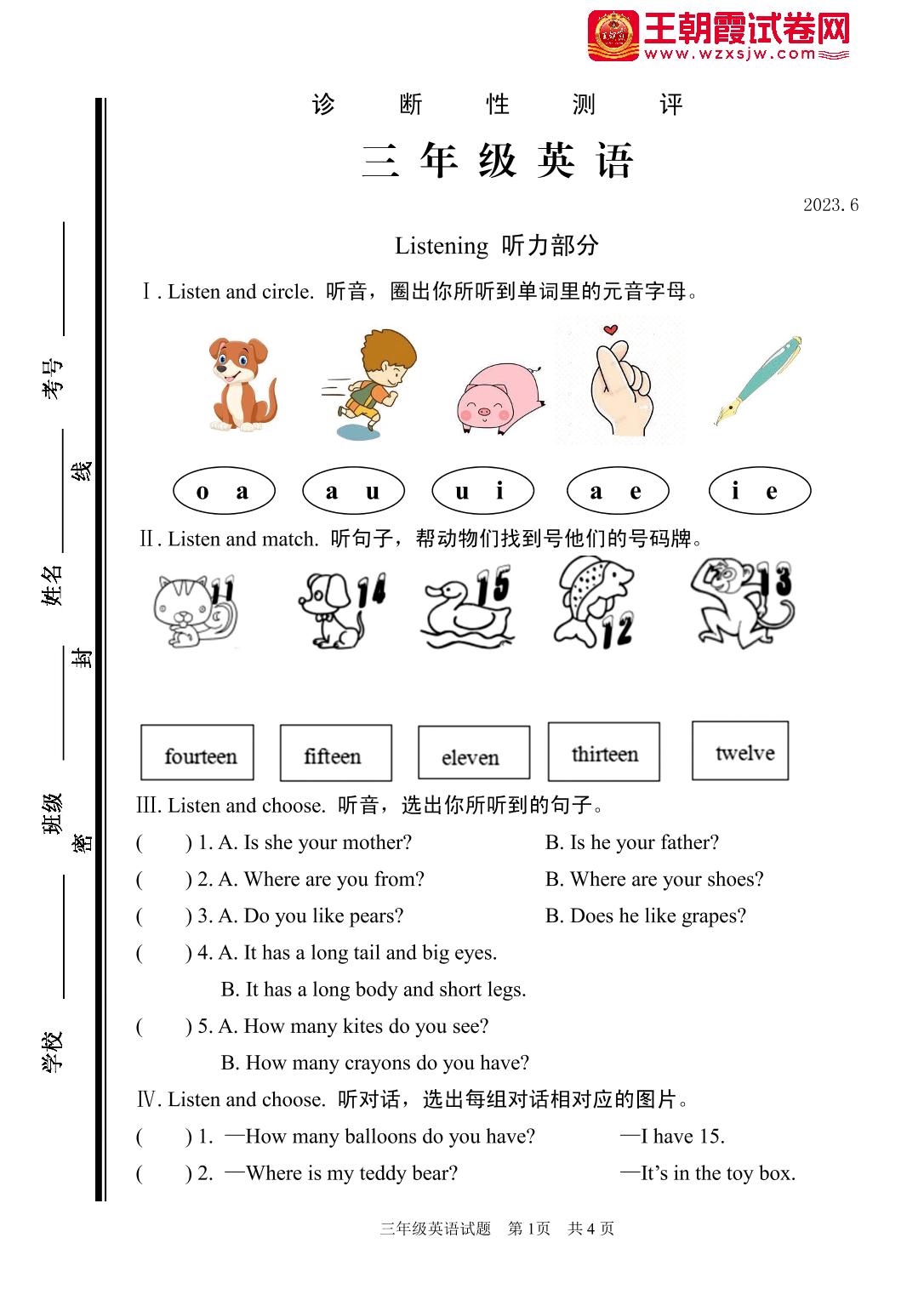 山东省枣庄市薛城区2022-2023学年下学期期末诊断学测评三年级英语(人教PEP版)【无听力音频】