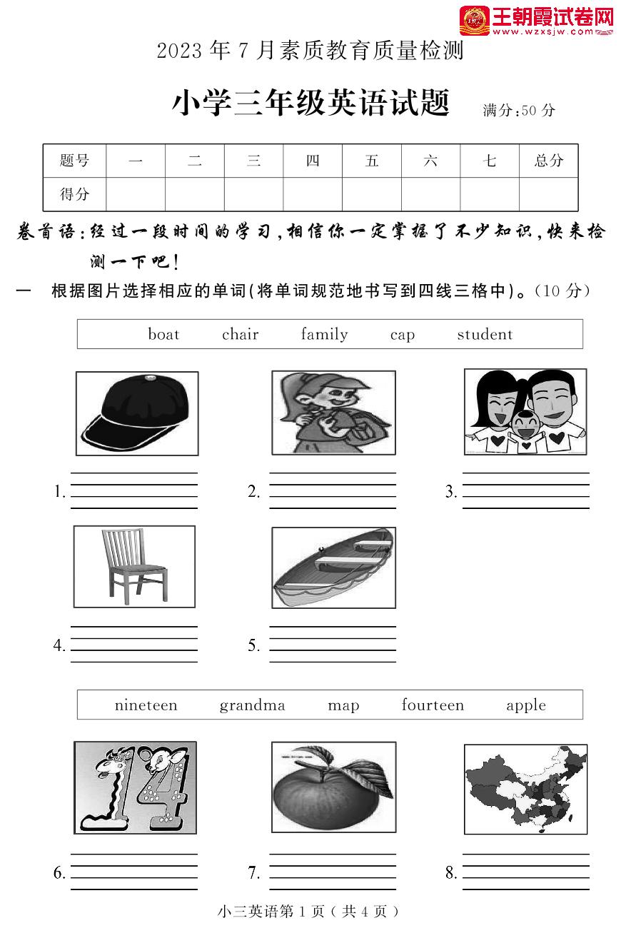 山东省菏泽市曹县2022-2023学年下学期7月期末素质教育质量检测三年级英语(人教PEP版)