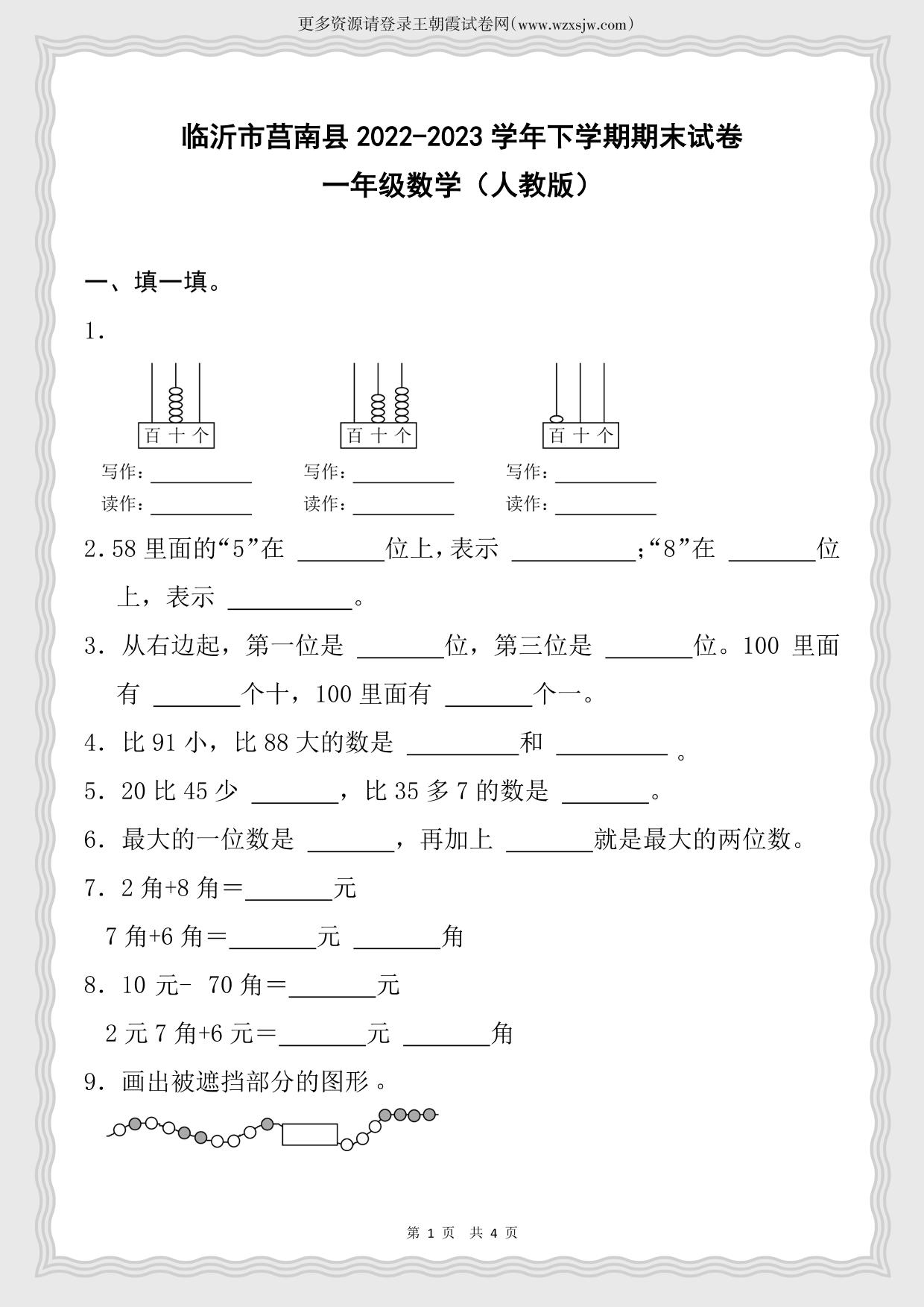 山东省临沂市莒南县2022-2023学年下学期期末试卷一年级数学(人教版)