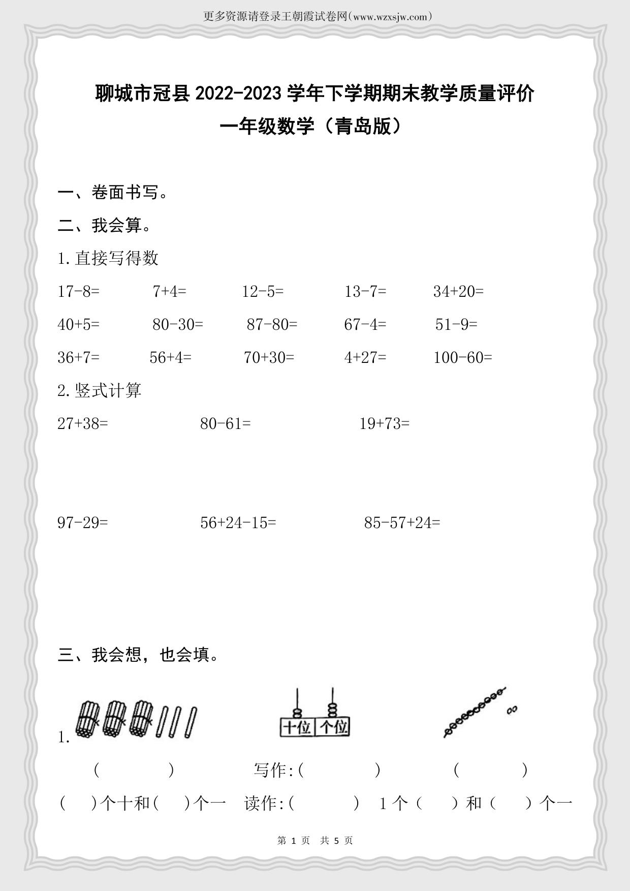 山东省聊城市冠县2022-2023学年下学期期末教学质量评价一年级数学(青岛版)