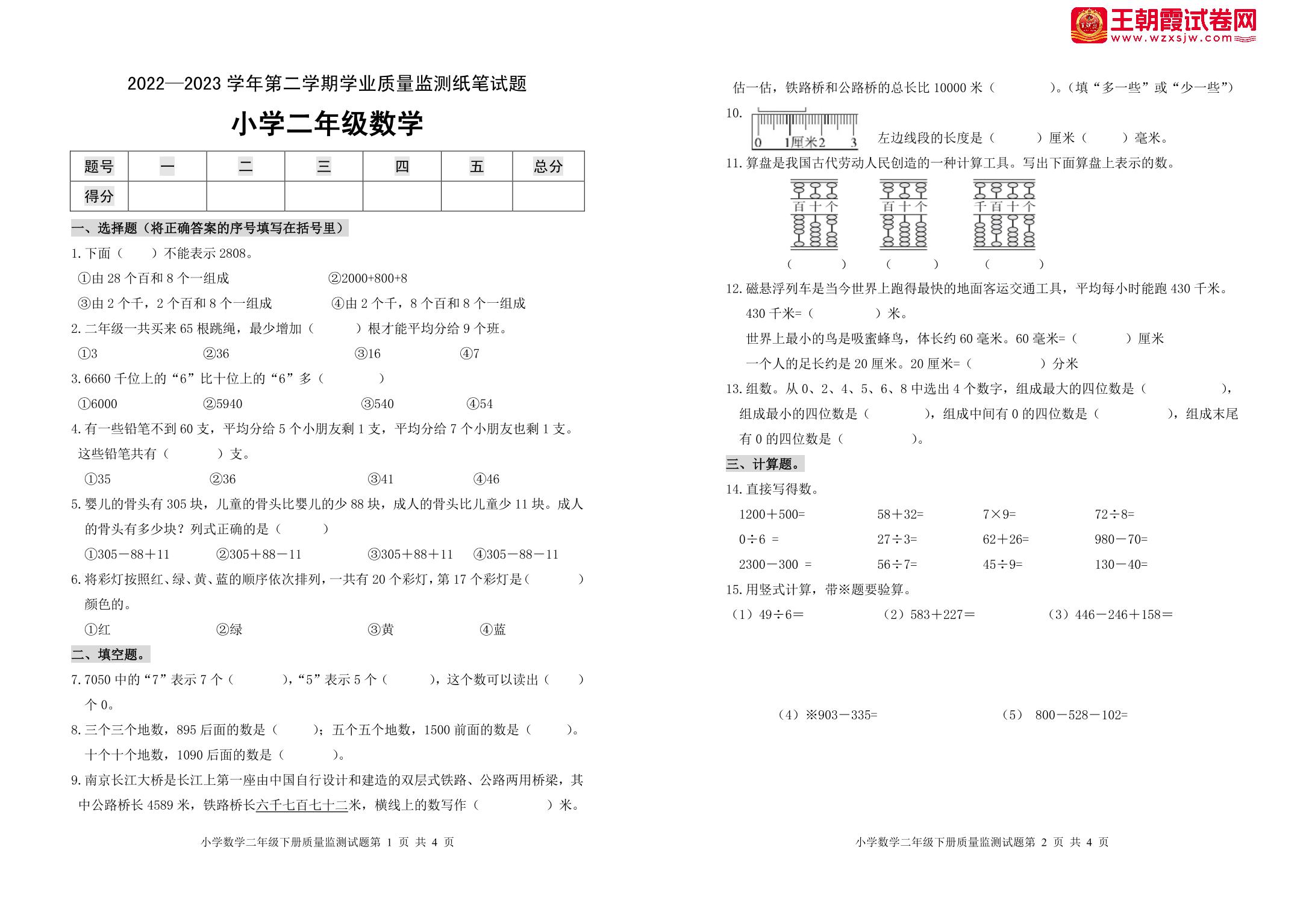 山东省滨州市无棣县2022-2023学年第二学期期末学业质量监测二年级数学(青岛版)