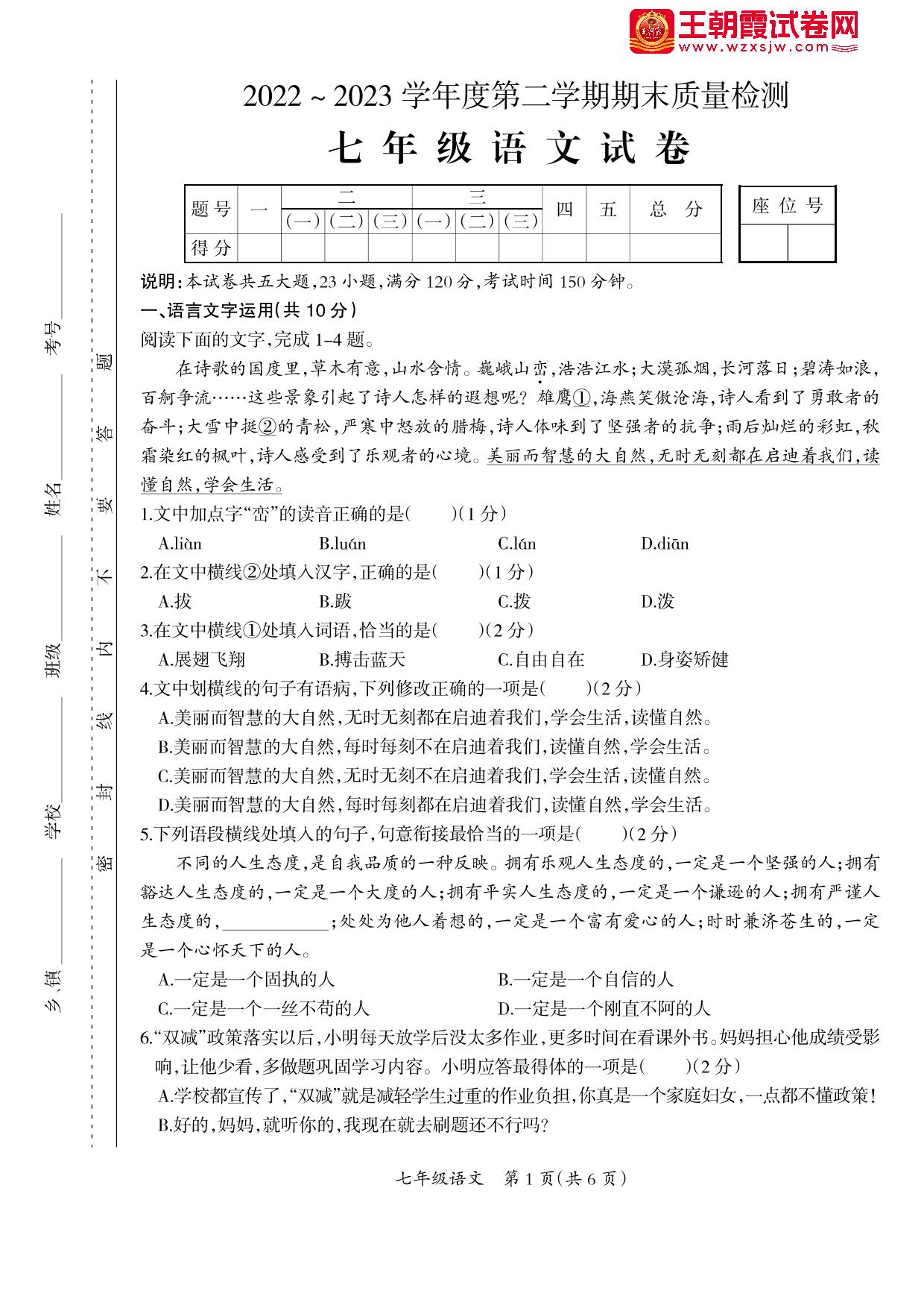 江西省井冈山市2022-2023学年度第二学期期末质量检测试卷七年级语文(人教版)
