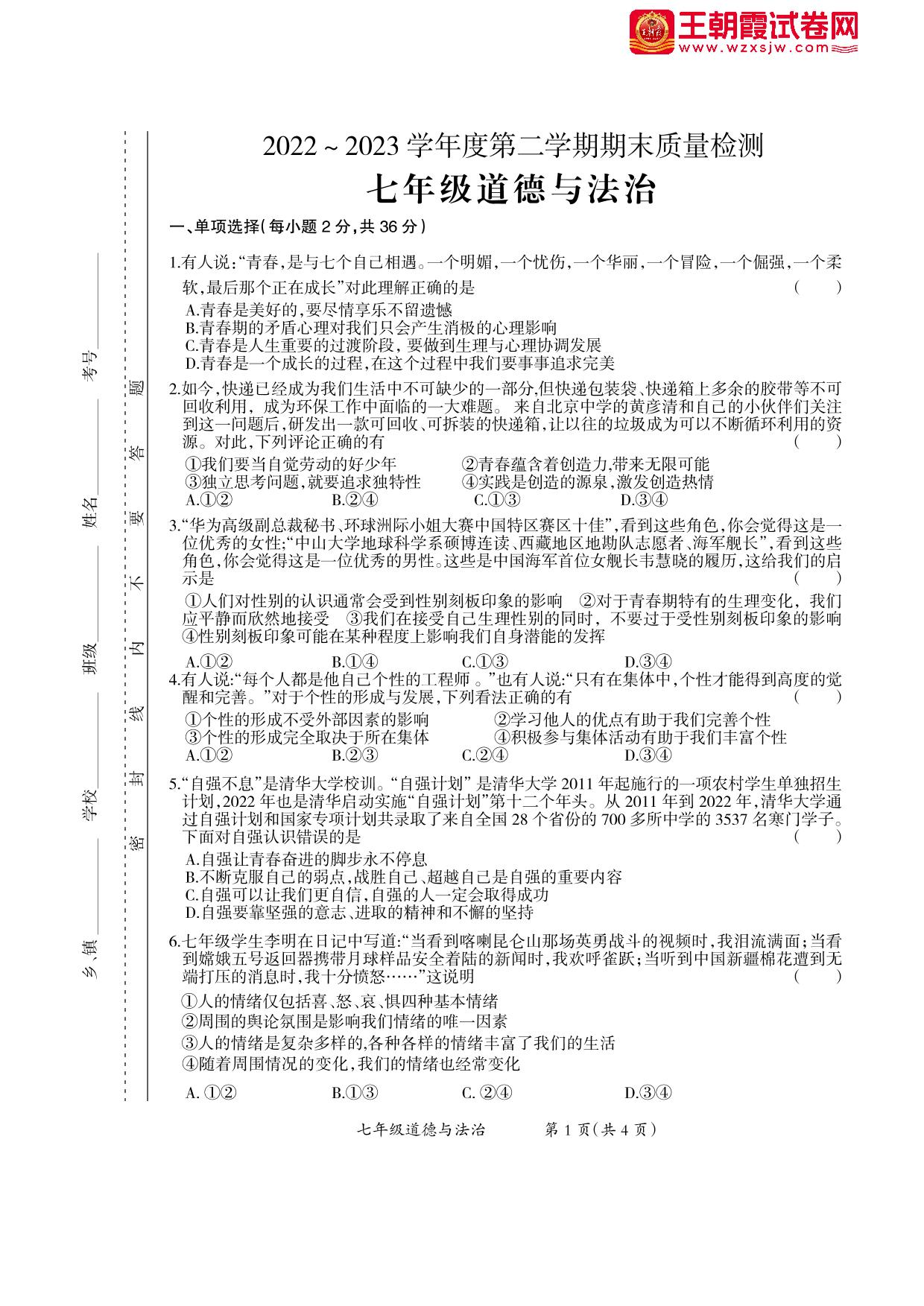 江西省井冈山市2022-2023学年度第二学期期末质量检测试卷七年级道德与法治(人教版)