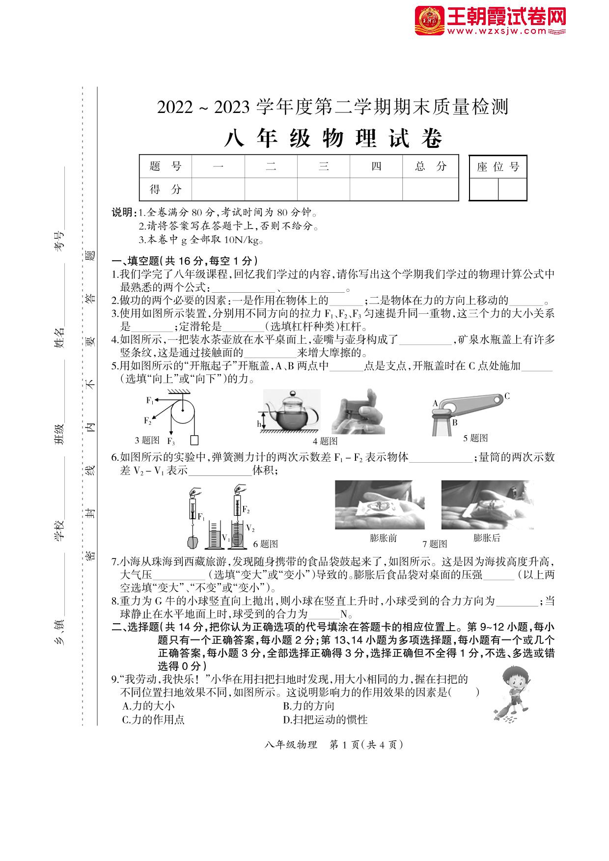 八年级物理人教版下册期末卷