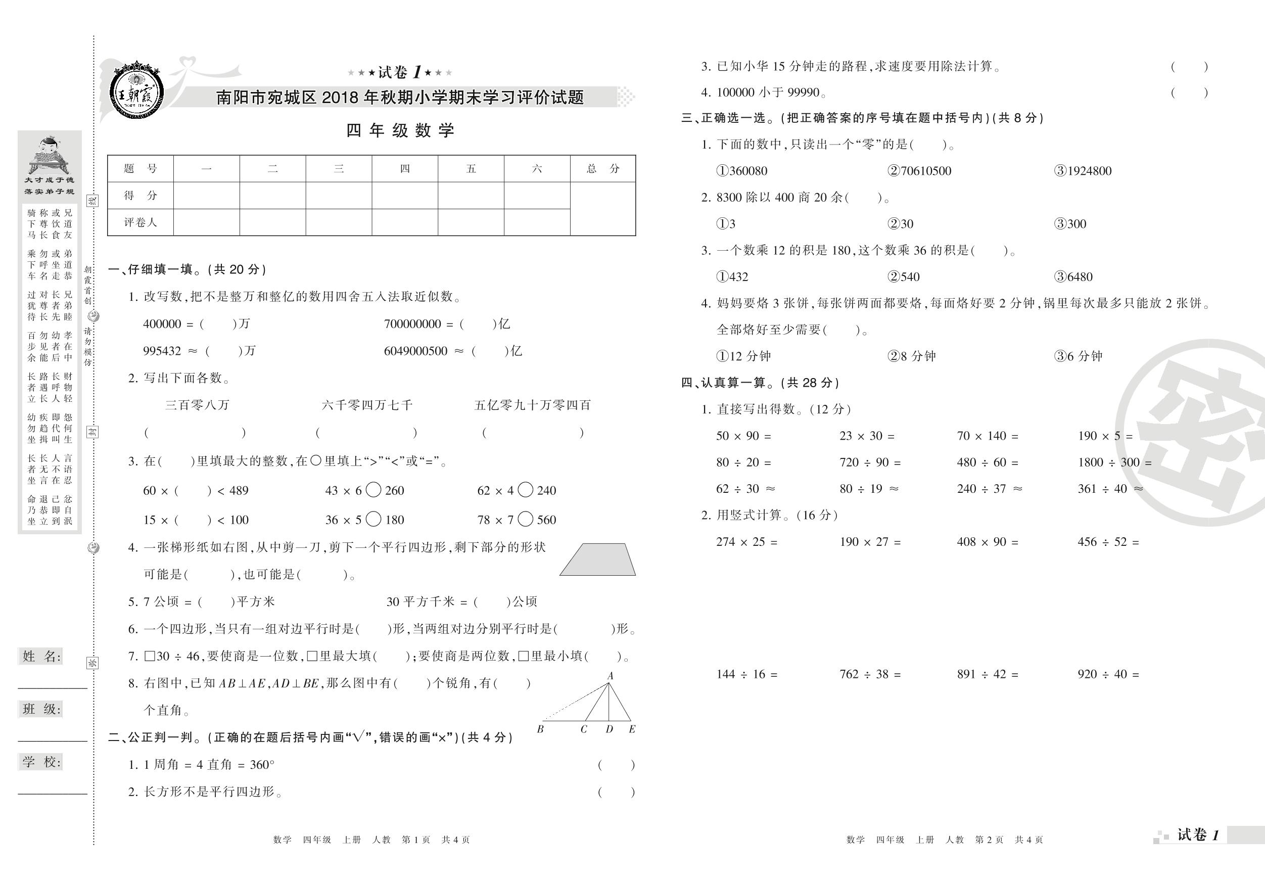 2018-2019学年第一学期南阳市宛城区四年级数学试卷(人教版)【1】