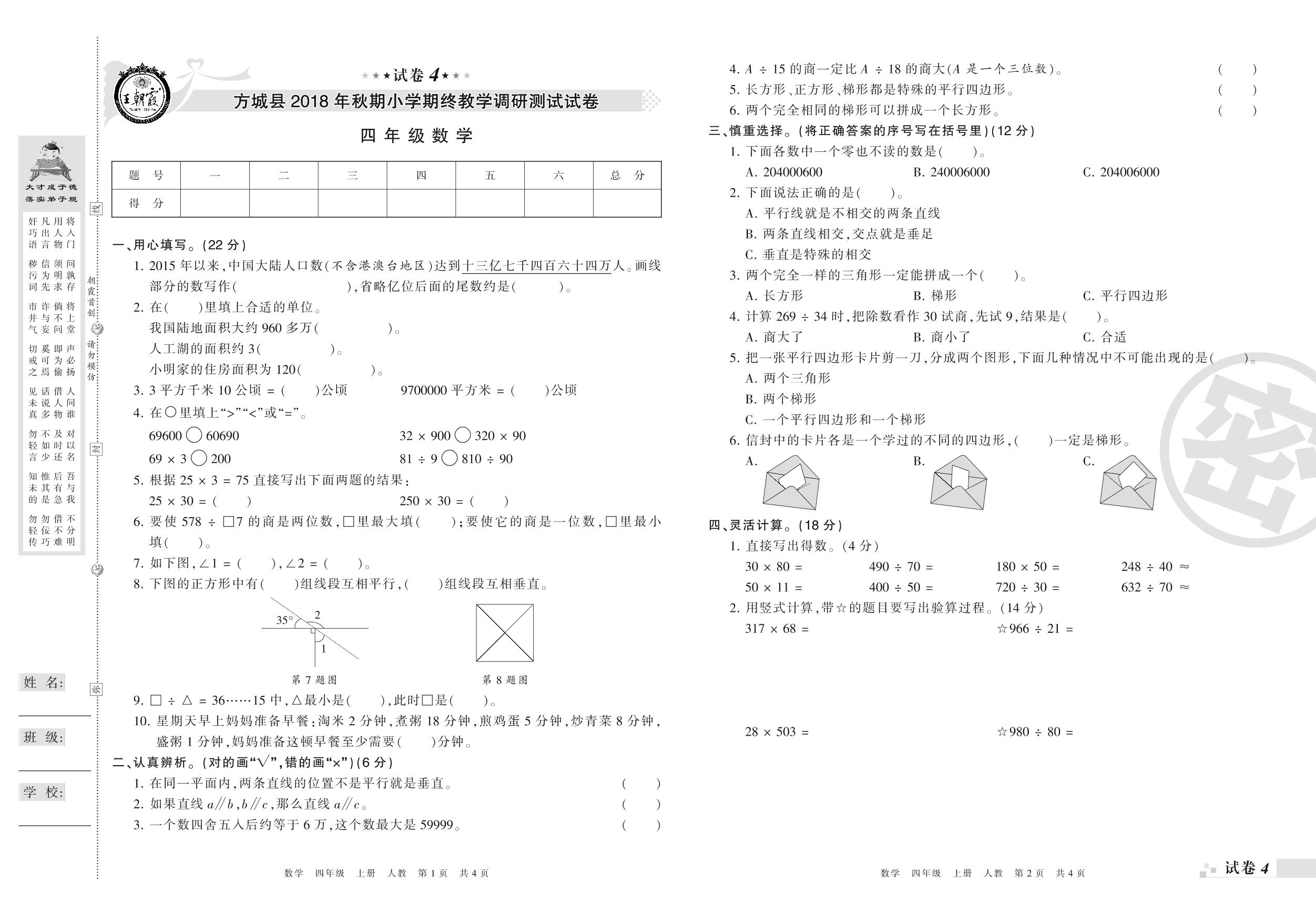2018-2019学年第一学期南阳市方城县四年级数学试卷(人教版)【4】