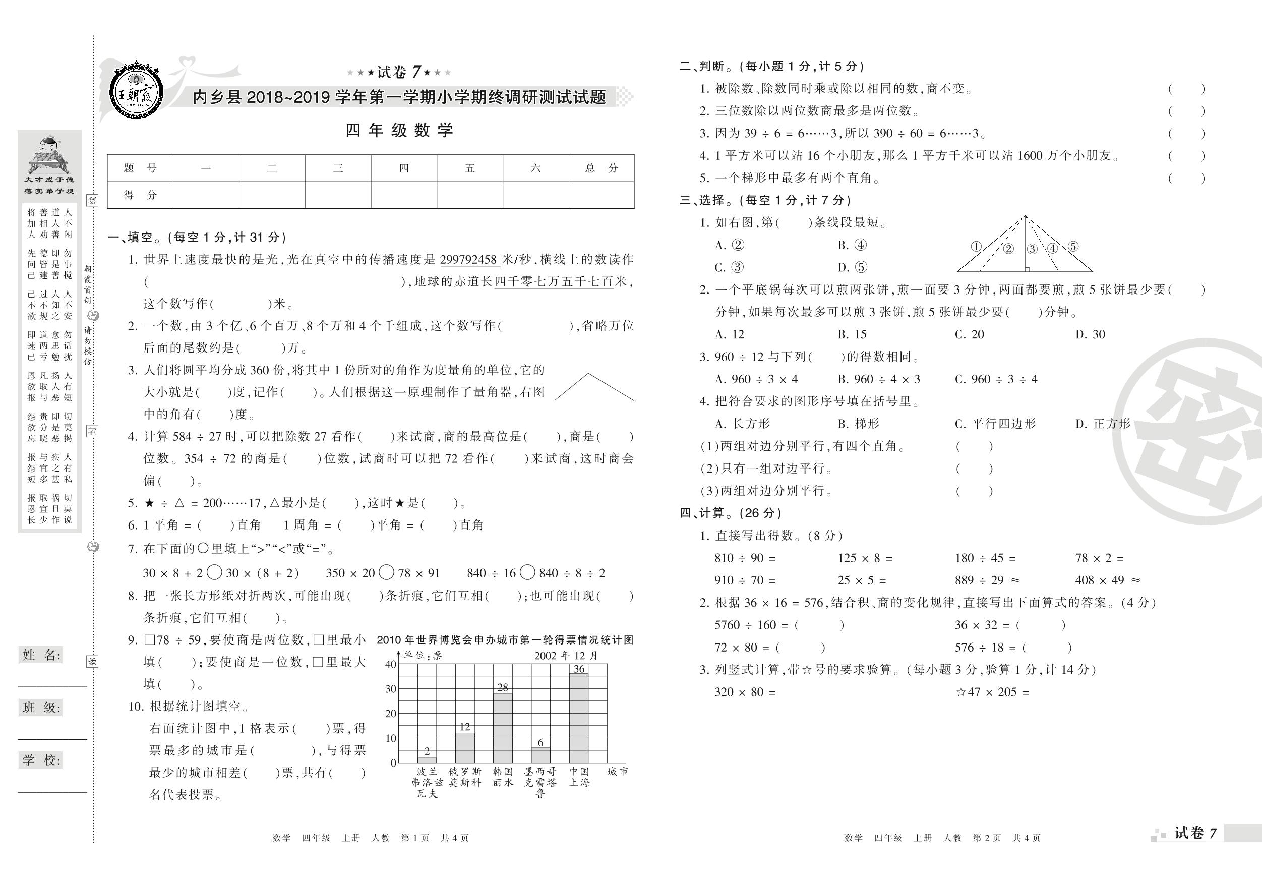 2018-2019学年第一学期南阳市内乡县四年级数学试卷(人教版)【7】