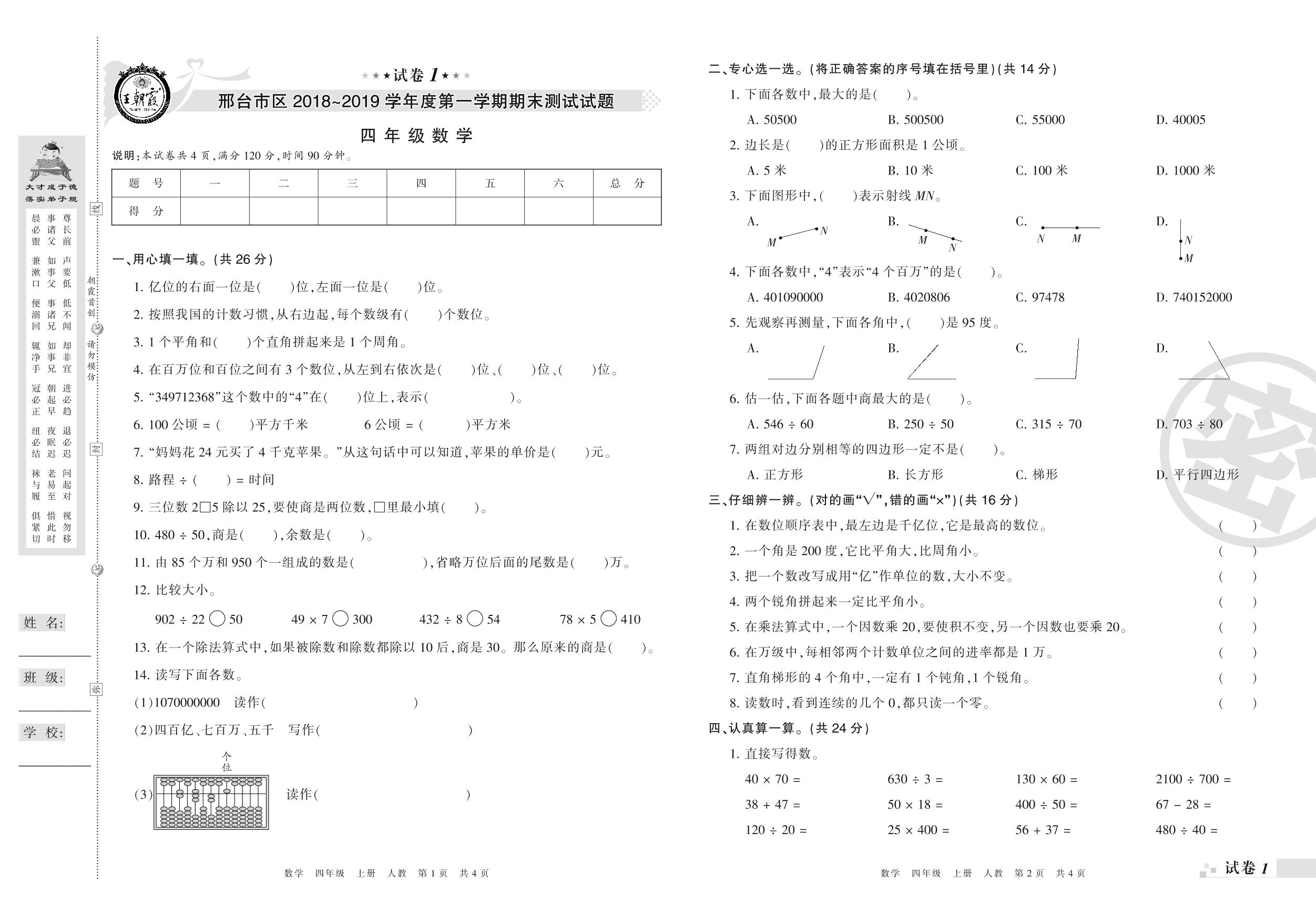 2018-2019学年第一学期邢台市区四年级数学试卷(人教版)【1】
