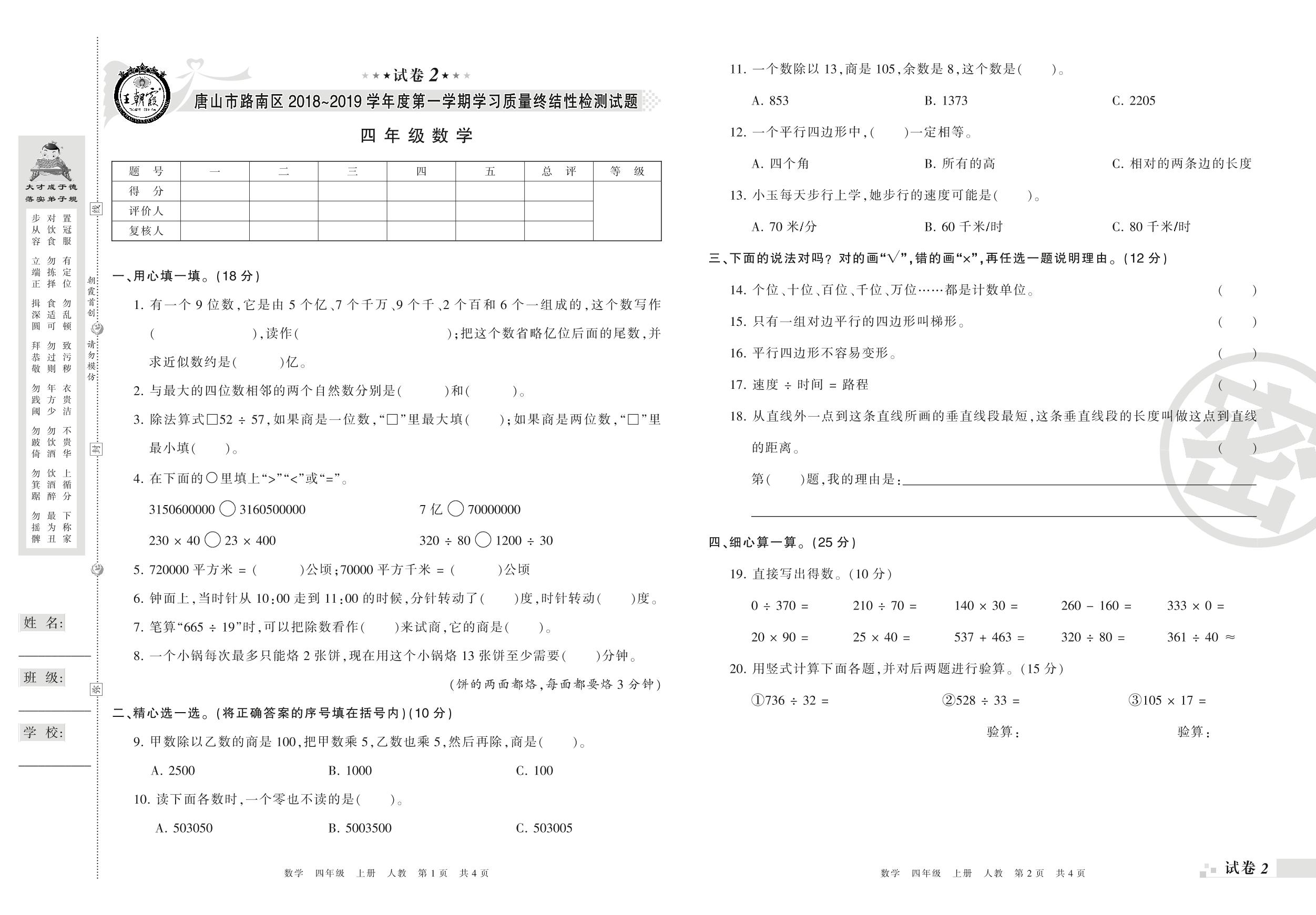 2018-2019学年第一学期唐山市路南区四年级数学试卷(人教版)【2】