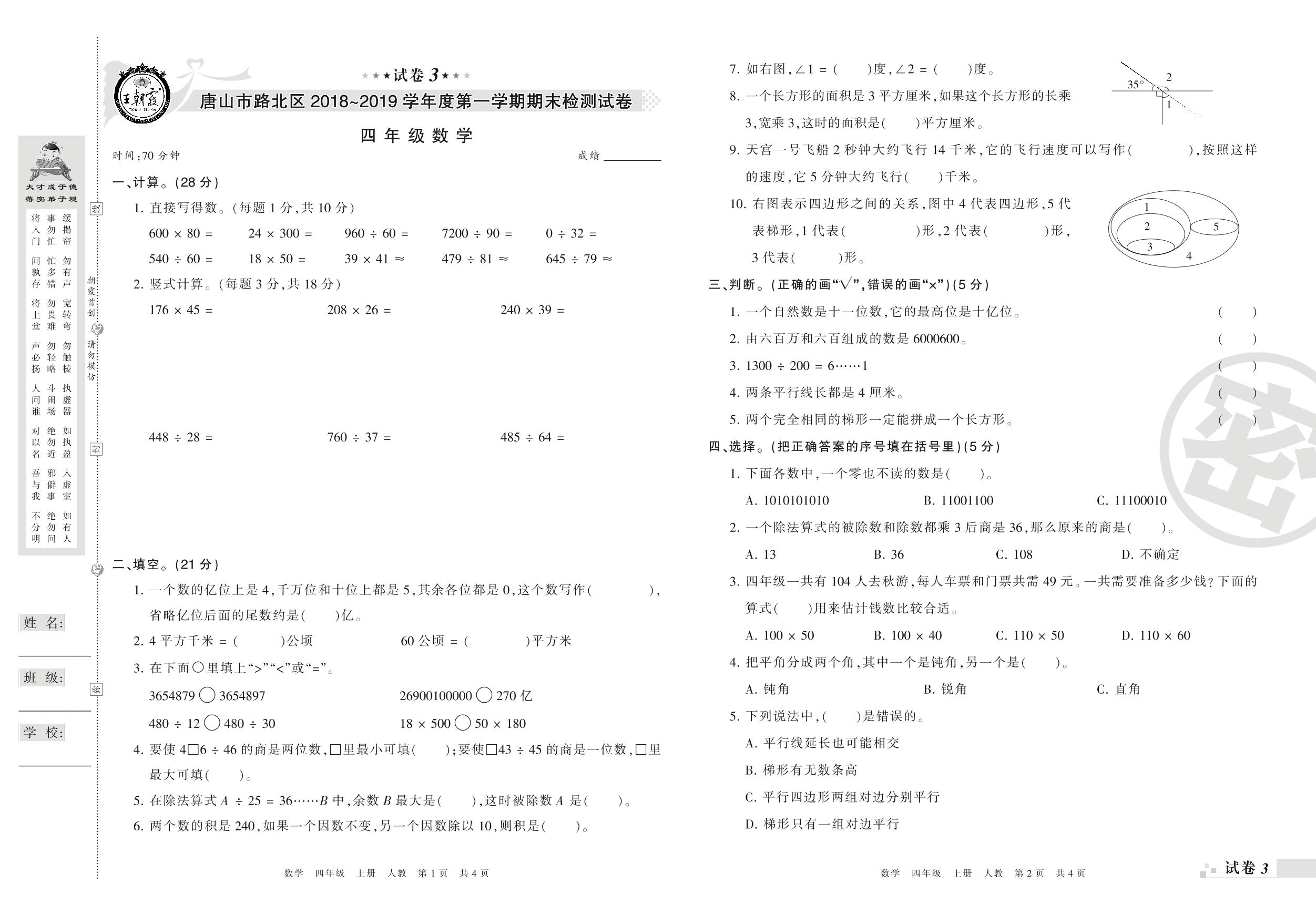 2018-2019学年第一学期唐山市路北区四年级数学试卷(人教版)【3】