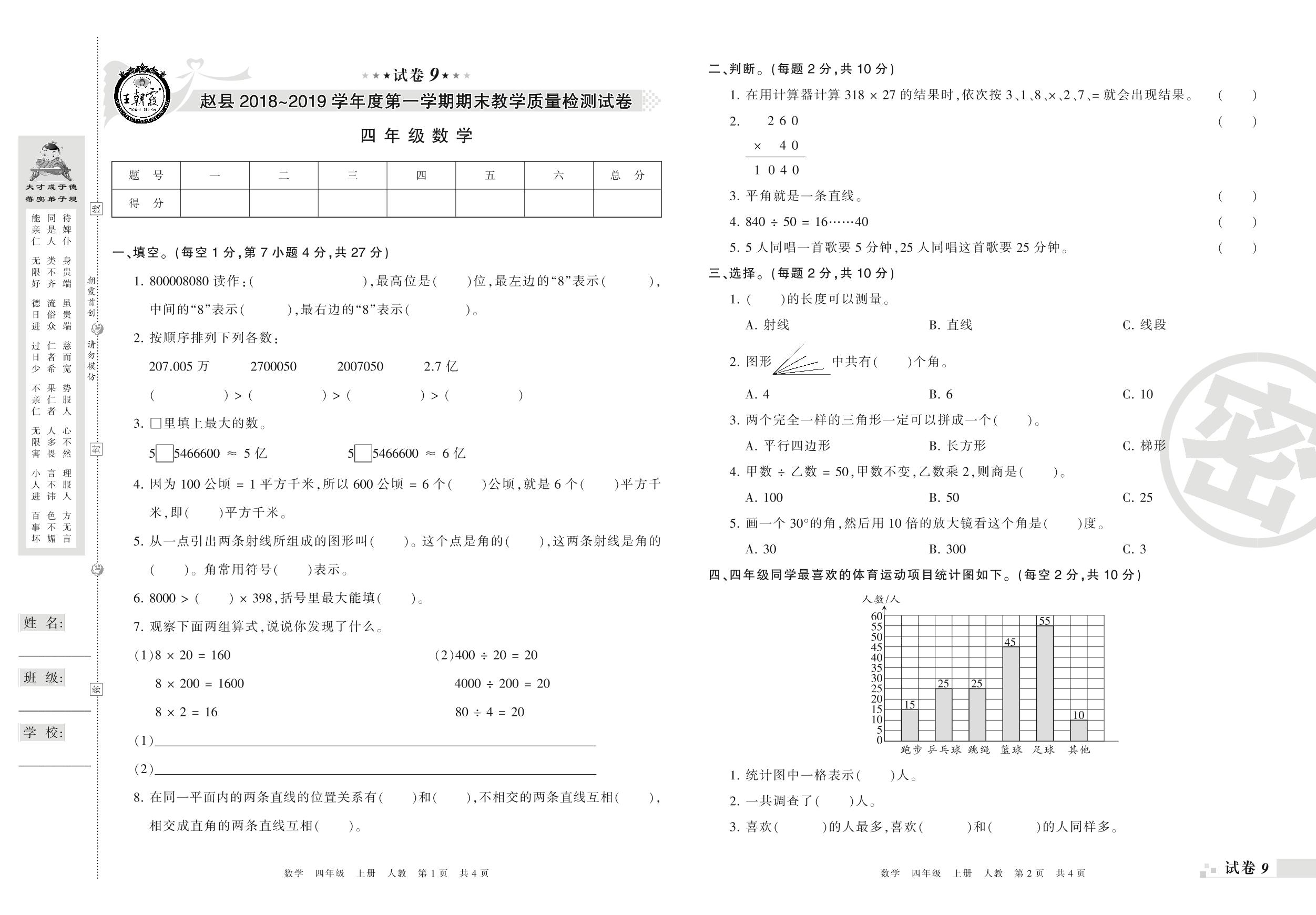 2018-2019学年第一学期石家庄市赵县四年级数学试卷(人教版)【9】