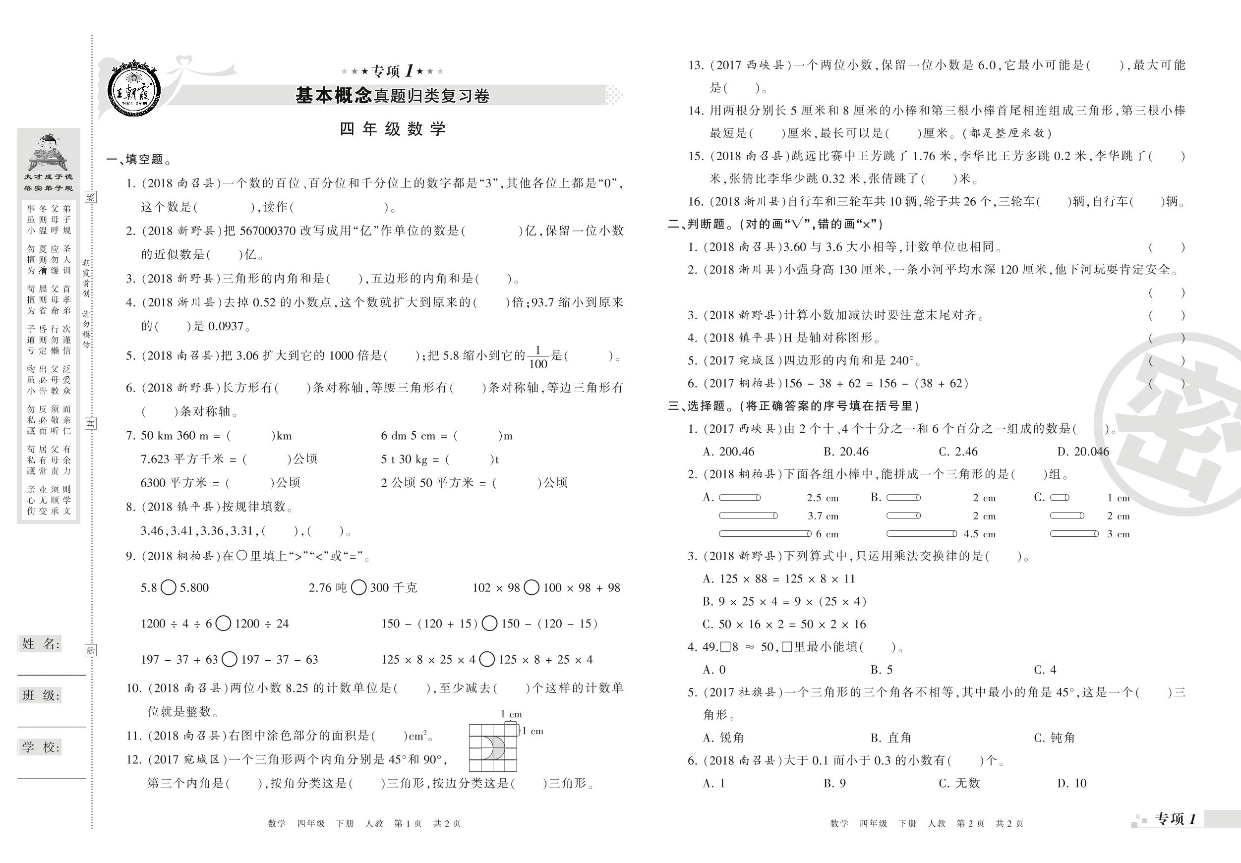 王朝霞期末专项卷——基本概念、计算真题归类复习卷四年级下册数学(人教版)_R210804145828【0】