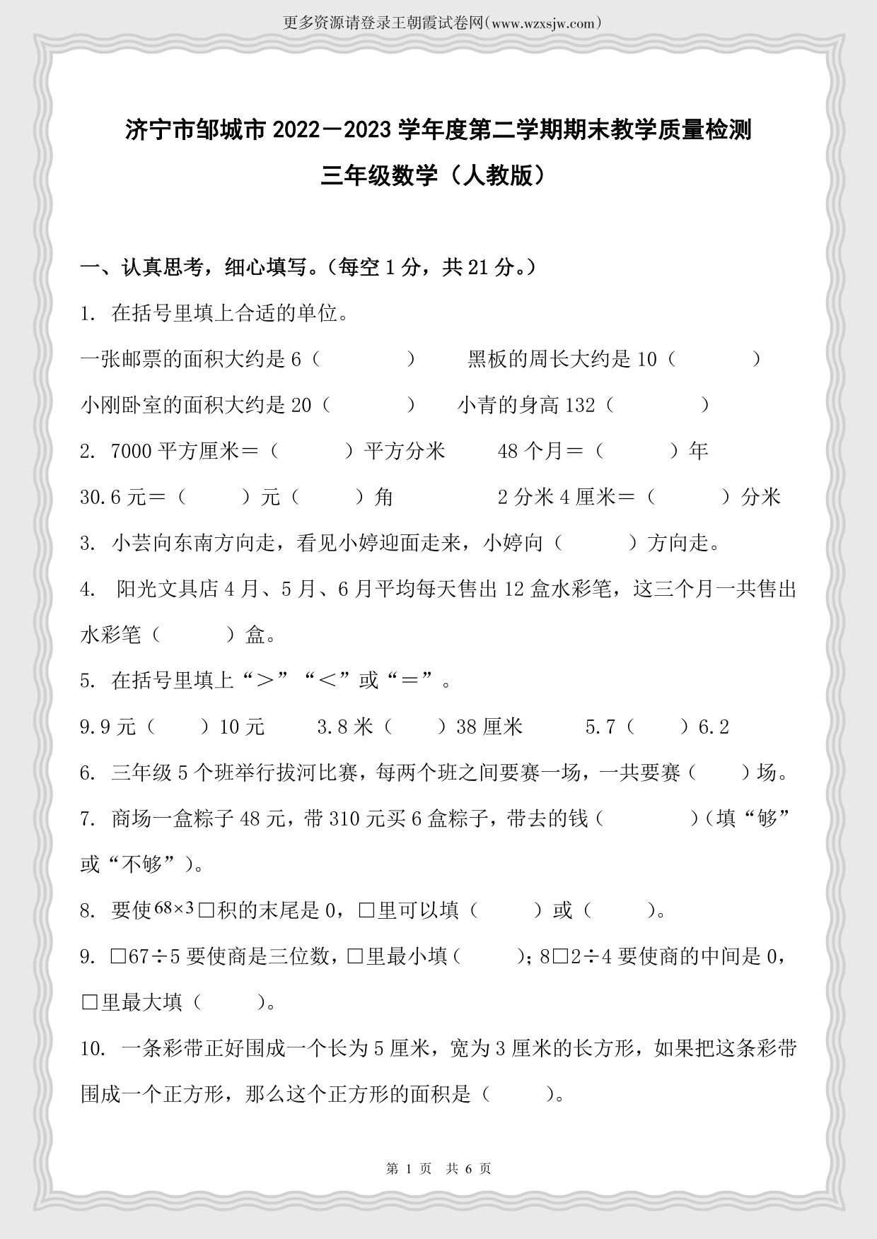 山东省济宁市邹城市2022-2023学年度第二学期期末教学质量检测三年级数学(人教版)