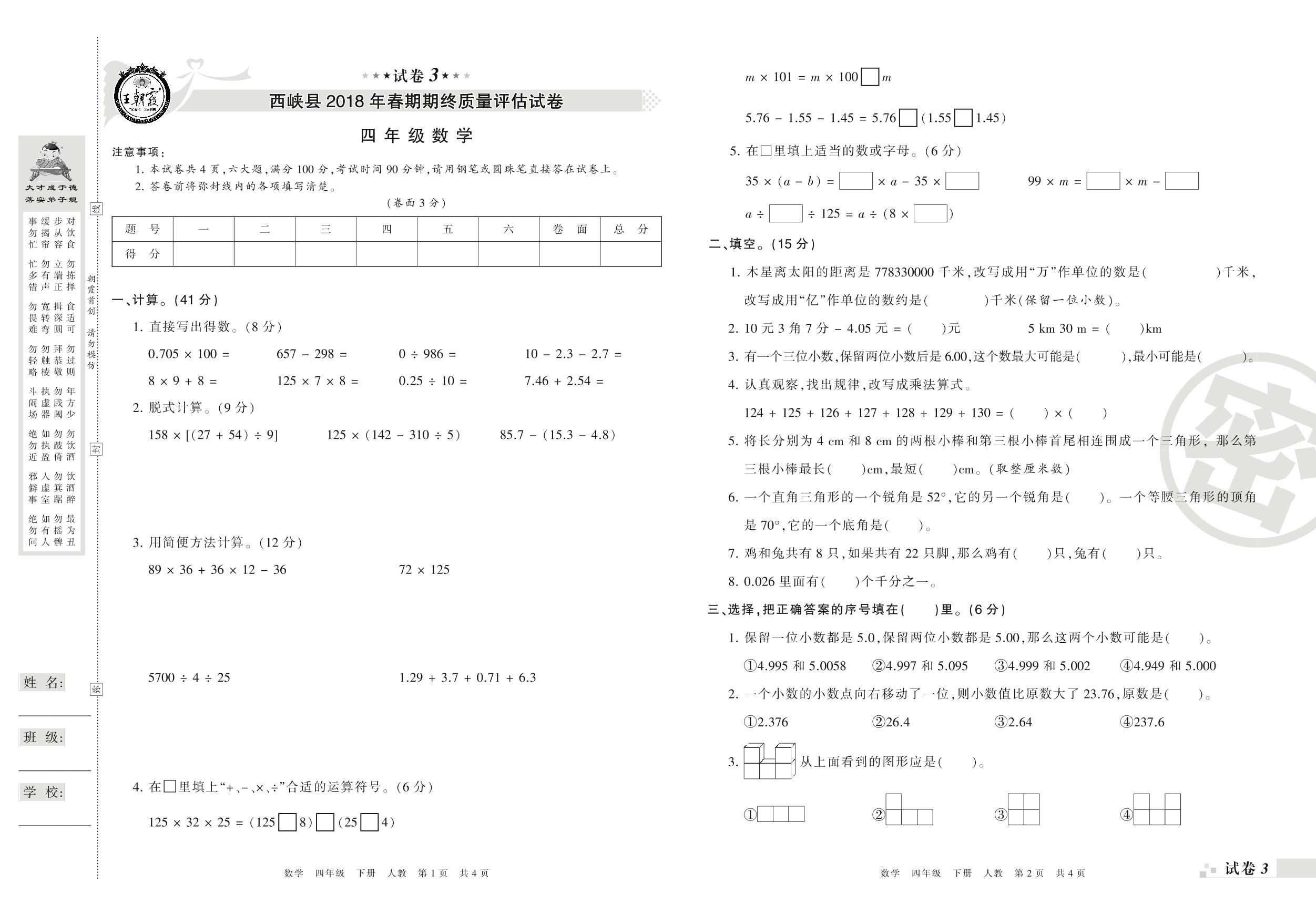 2017-2018学年第二学期南阳市西峡县四年级数学试卷(人教版)【3】