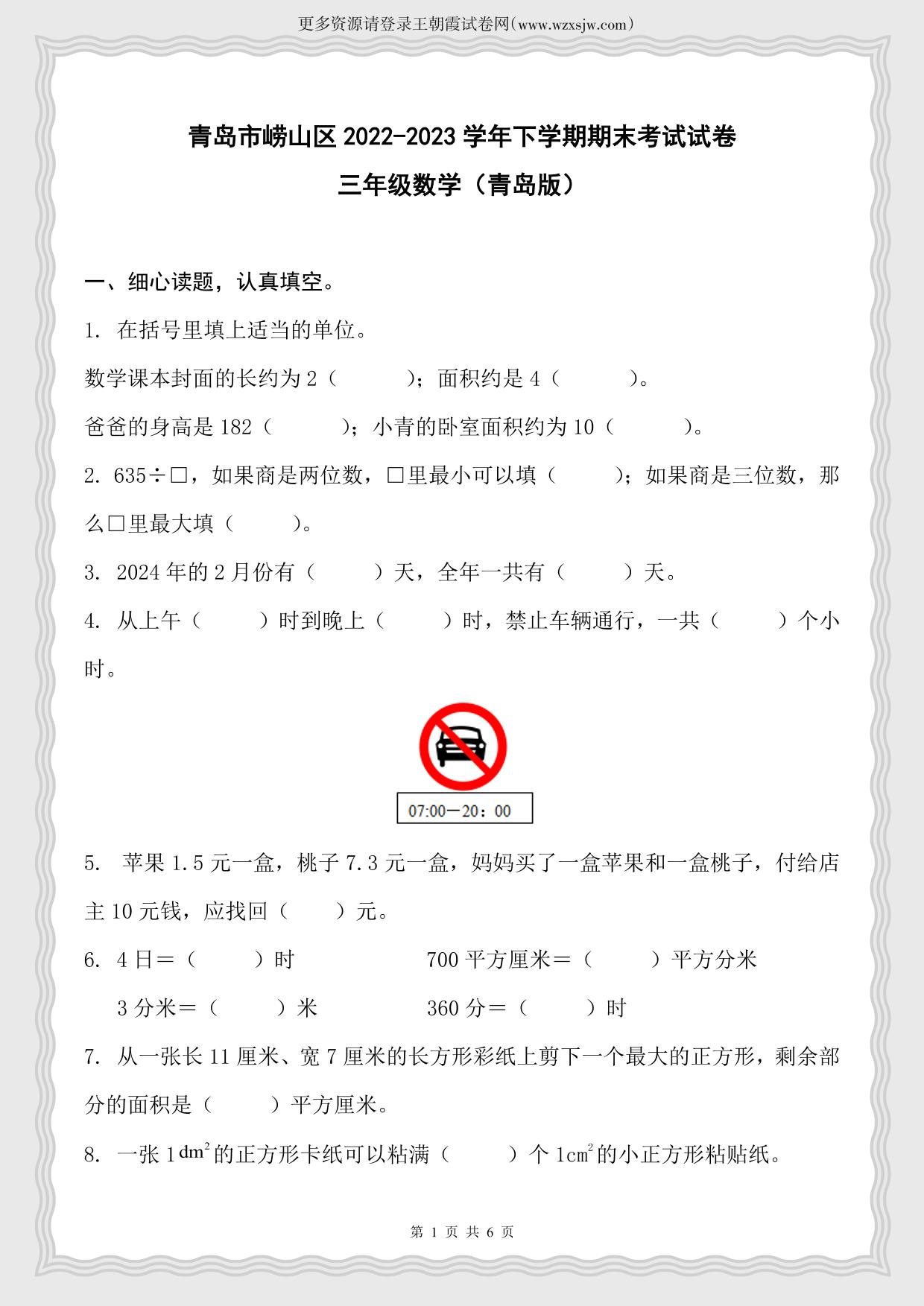 山东省青岛市崂山区2022-2023学年下学期期末考试试卷三年级数学(青岛版)
