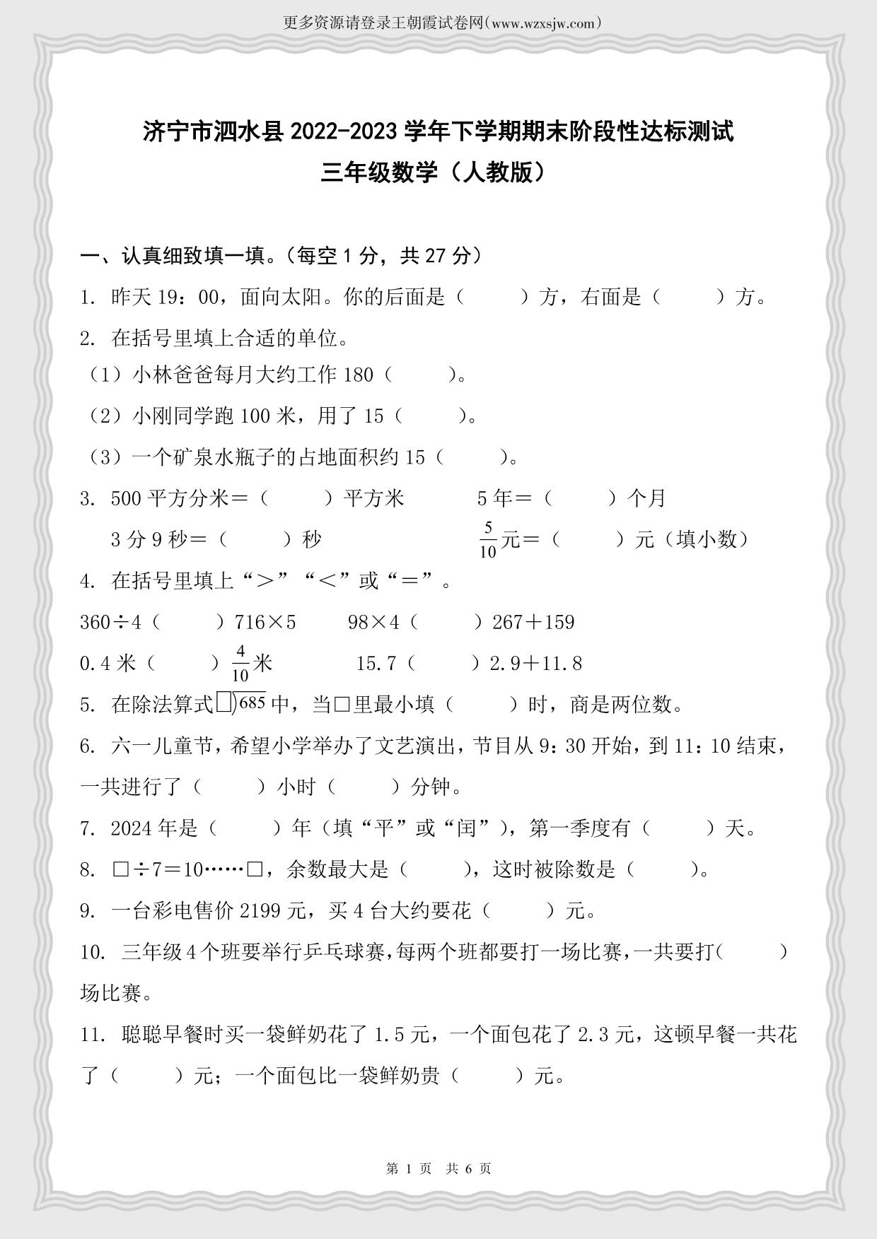 山东省济宁市泗水县2022-2023学年下学期期末阶段性达标测试三年级数学(人教版)