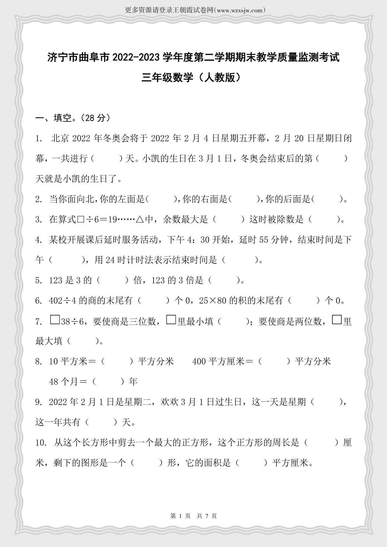 山东省济宁市曲阜市2022-2023学年度第二学期期末教学质量监测考试三年级数学(人教版)