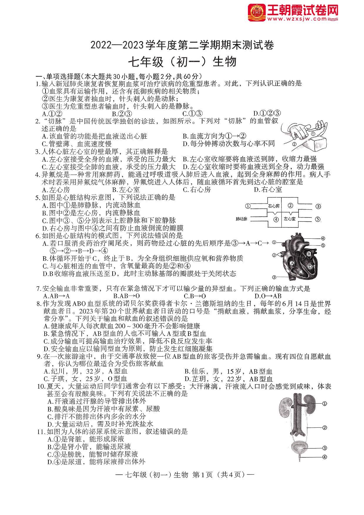 江西省南昌市2022-2023学年度第二学期期末测试卷七年级生物(人教版)