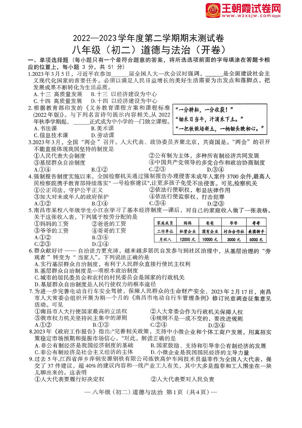 江西省南昌市2022-2023学年度第二学期期末测试卷八年级道德与法治(人教版)
