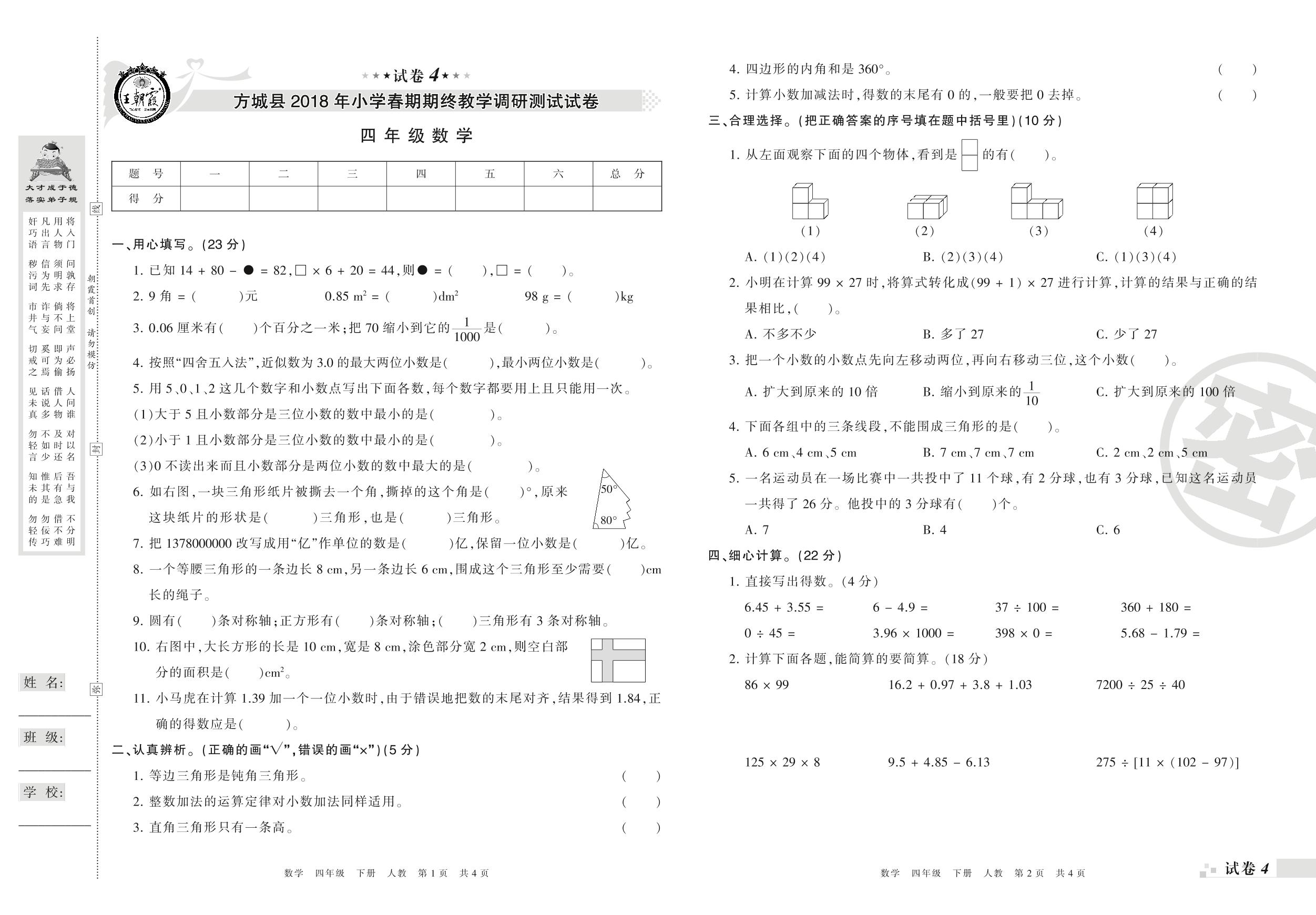 2017-2018学年第二学期南阳市方城县四年级数学试卷(人教版)【4】