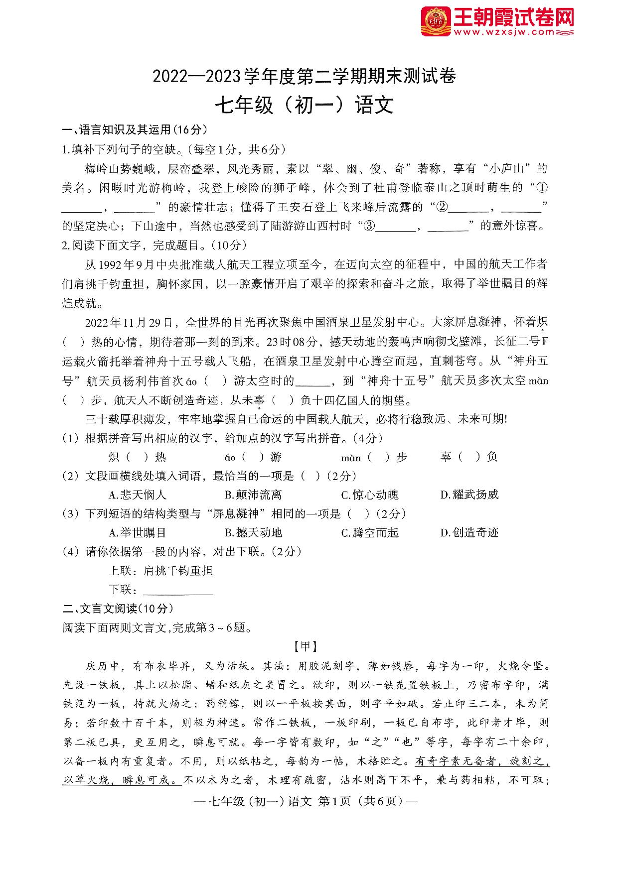 江西省南昌市2022-2023学年度第二学期期末测试卷七年级语文(人教版)