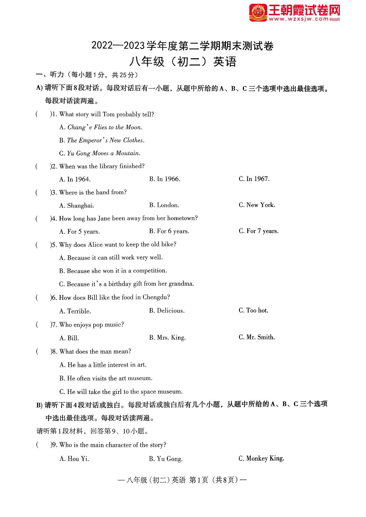 江西省南昌市2022-2023学年度第二学期期末测试卷八年级英语(人教版)