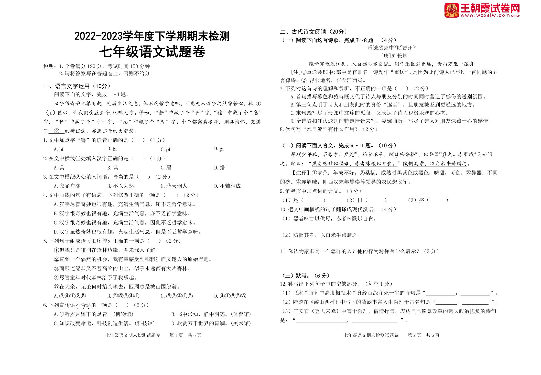 七年级语文人教版下册期末卷