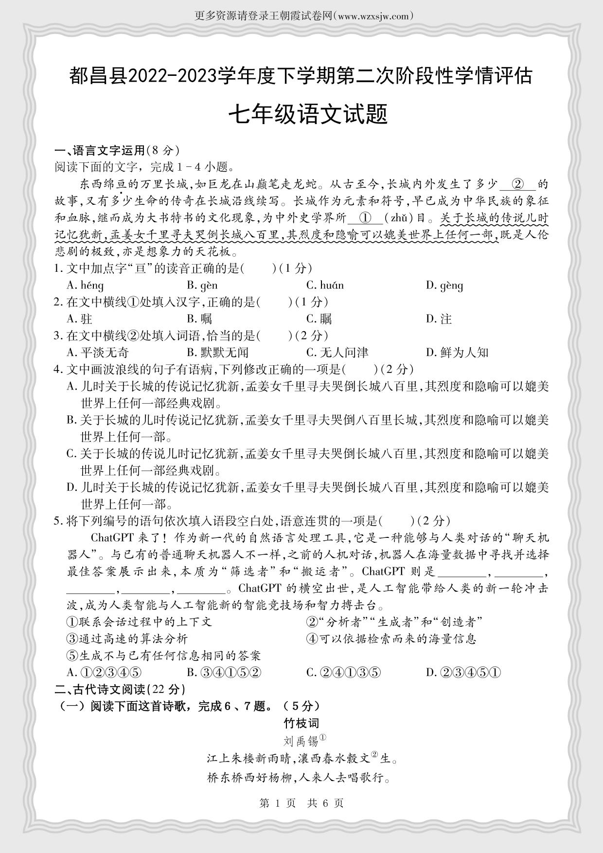 江西省九江市都昌县2022-2023学年度下学期第二次学情评估期末试题七年级语文(人教版)
