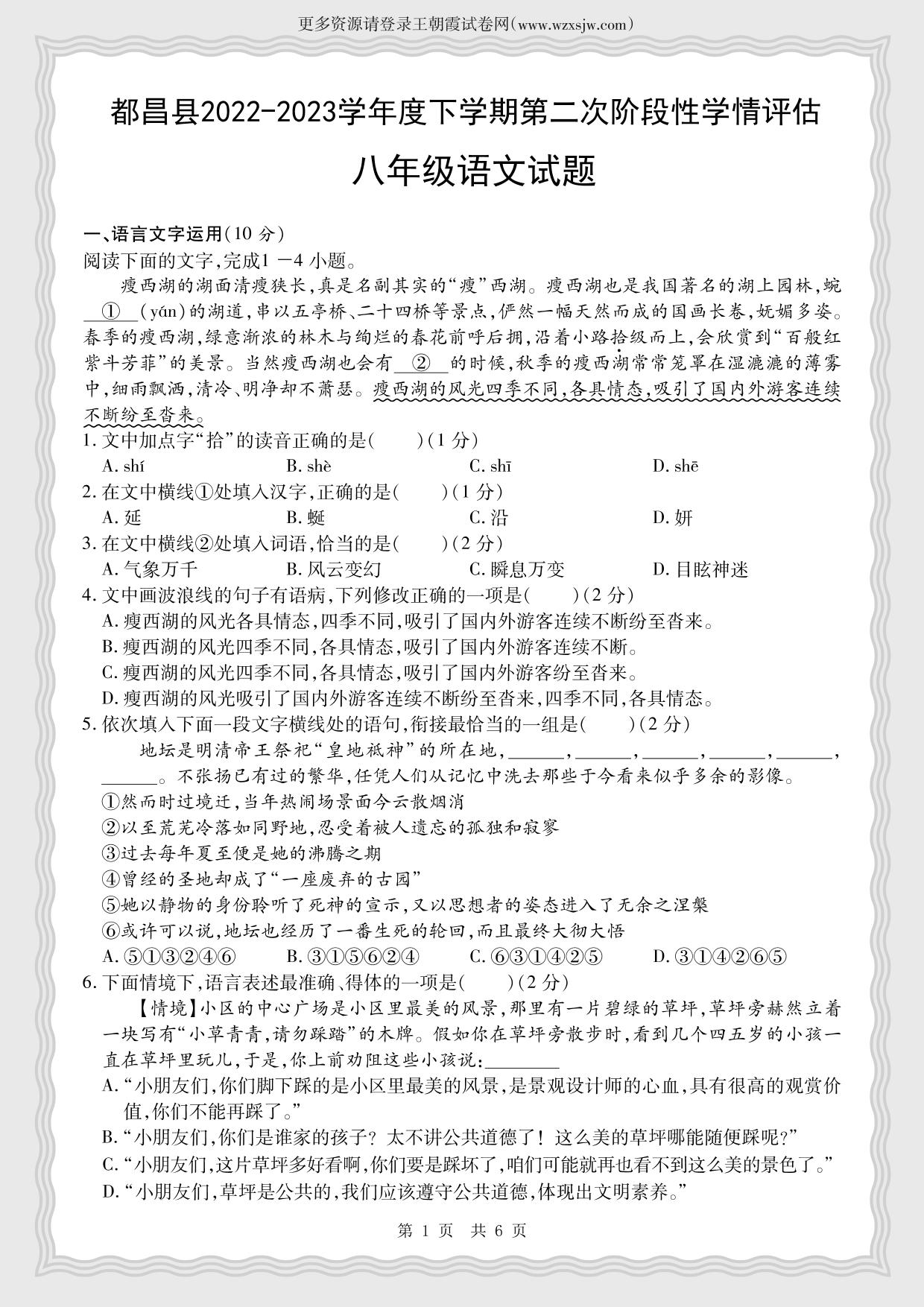 江西省九江市都昌县2022-2023学年度下学期第二次学情评估期末试题八年级语文(人教版)