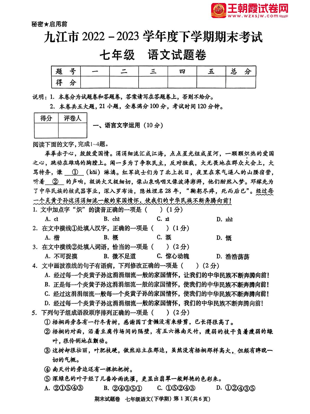 江西省九江市2022-2023学年度下学期期末考试试题卷七年级语文(人教版)