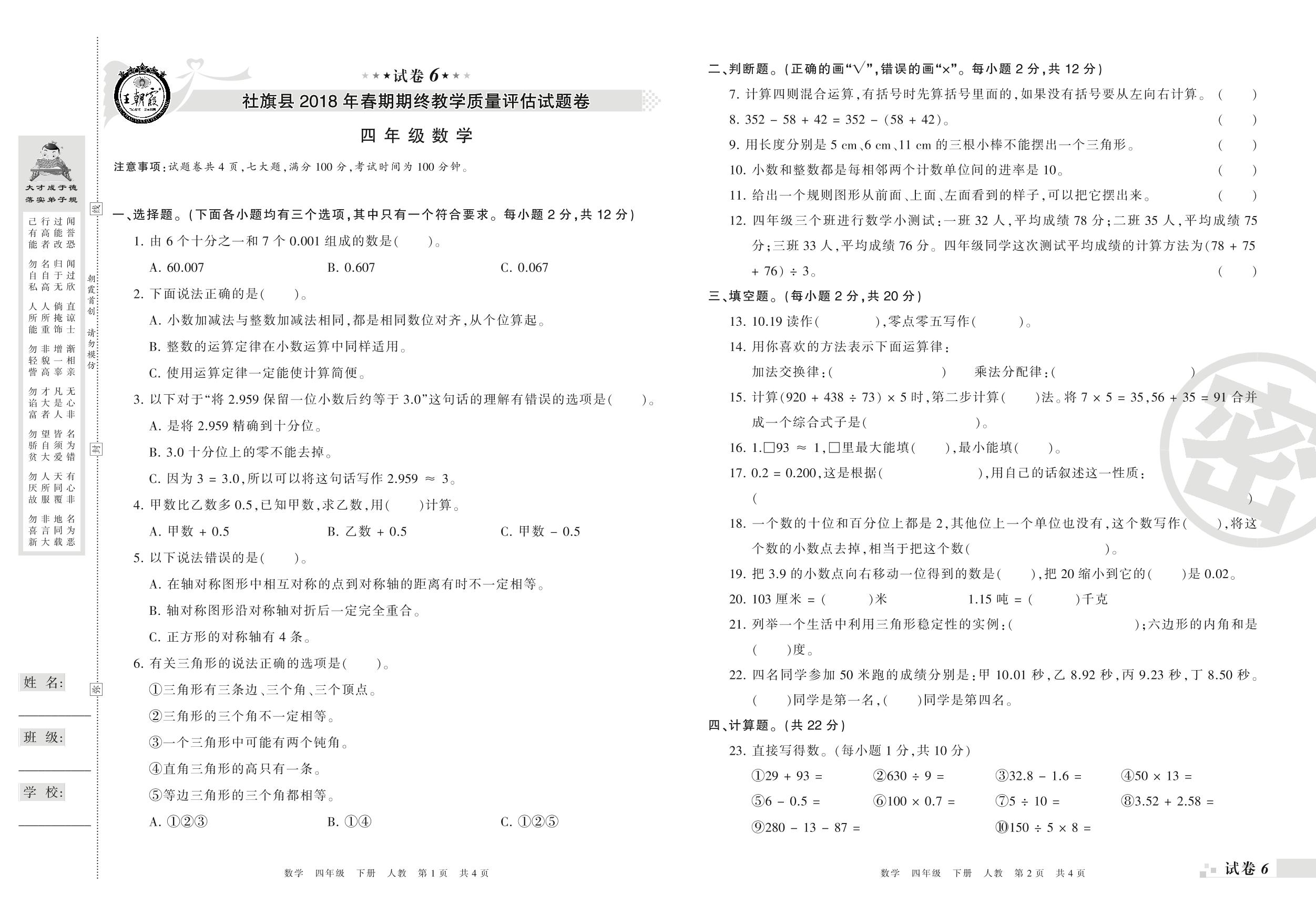 2017-2018学年第二学期南阳市社旗县四年级数学试卷(人教版)【6】