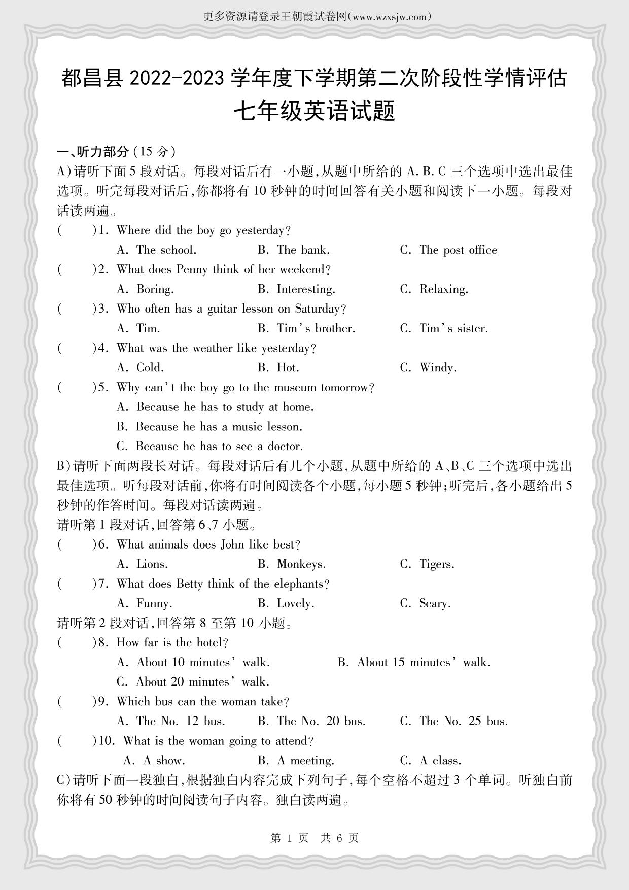 江西省九江市都昌县2022-2023学年度下学期第二次学情评估期末试题七年级英语【无听力音频】(人教版)