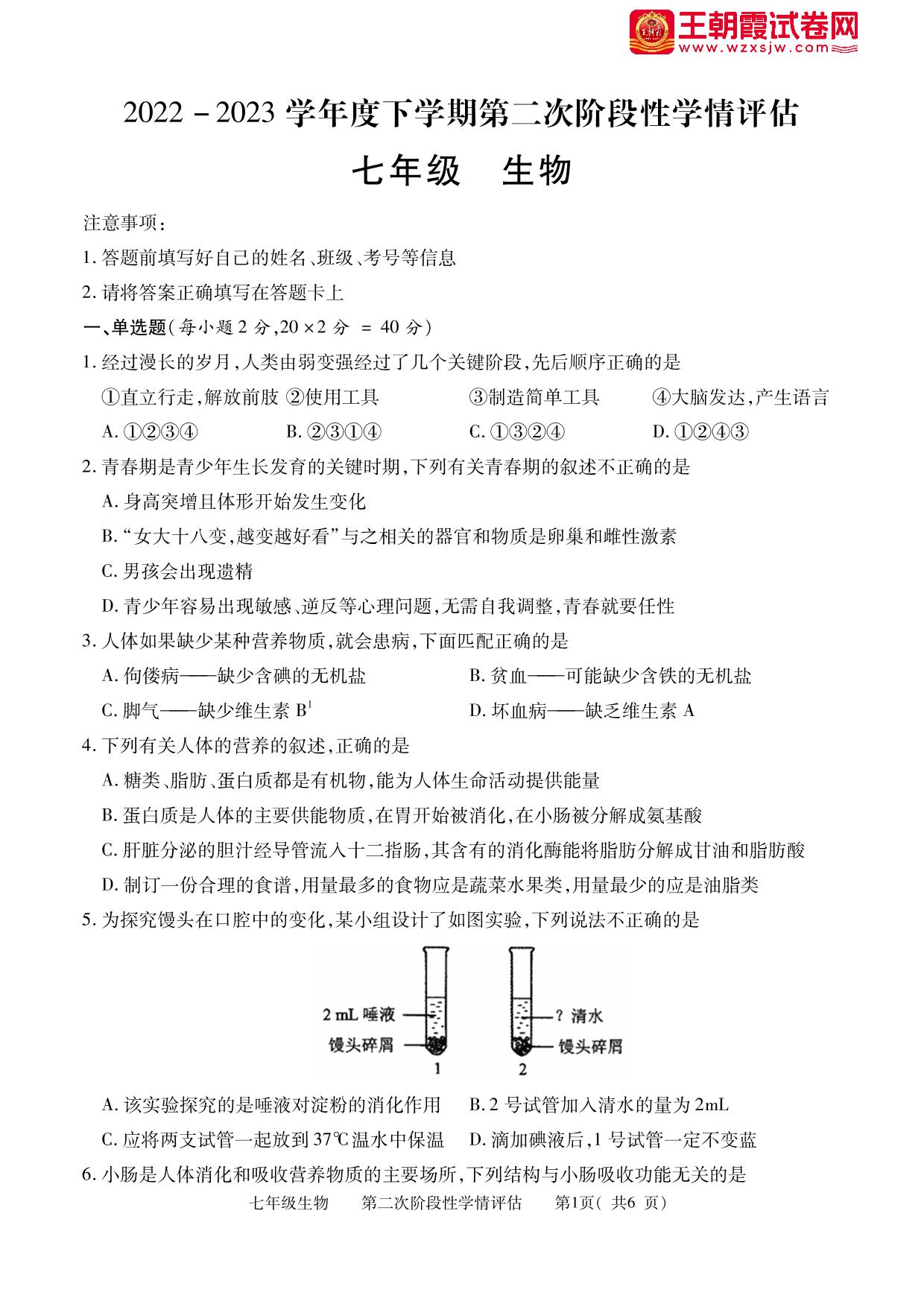 江西省九江市都昌县2022-2023学年度下学期第二次学情评估期末试题七年级生物(人教版)