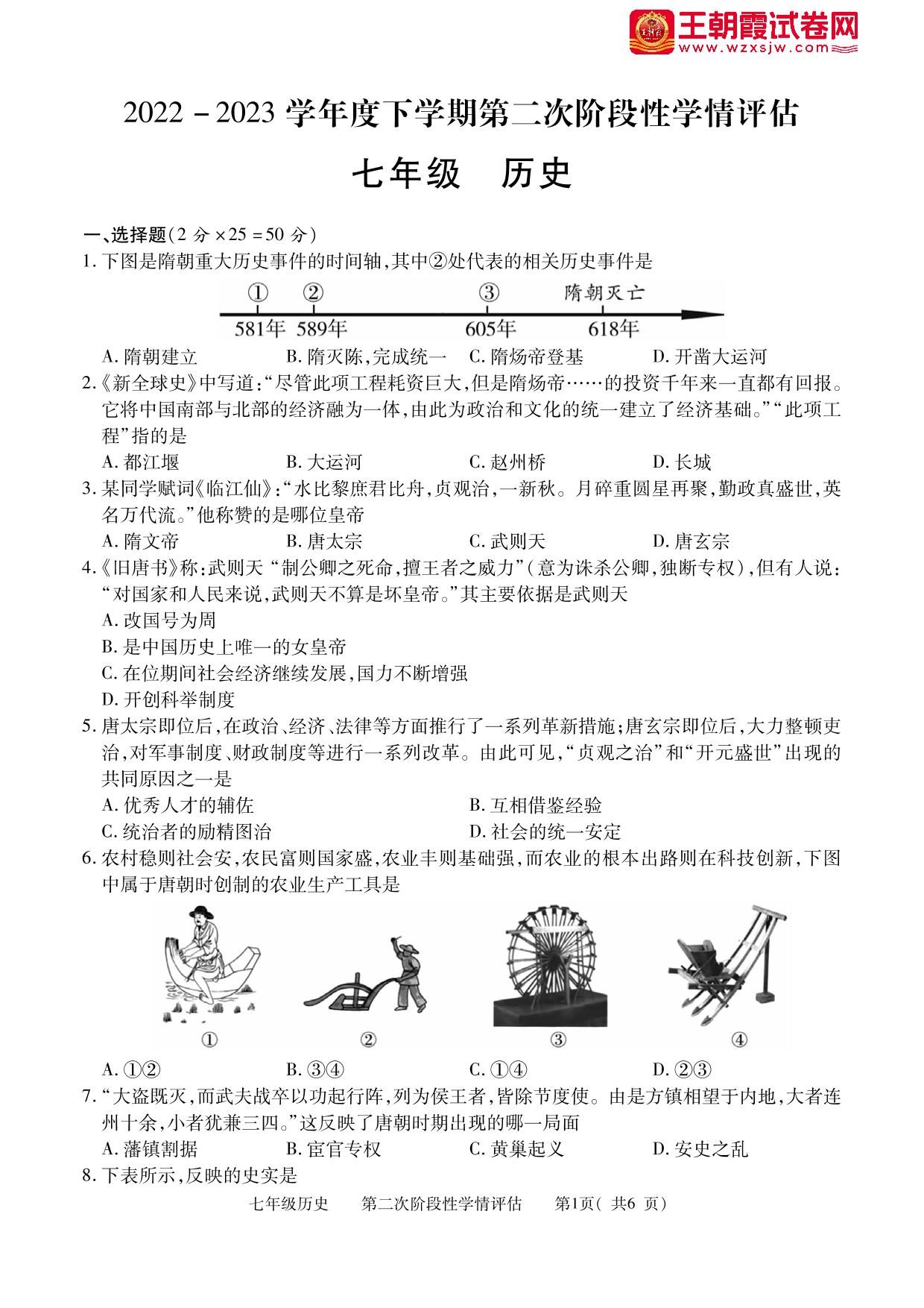 江西省九江市都昌县2022-2023学年度下学期第二次学情评估期末试题七年级历史(人教版)