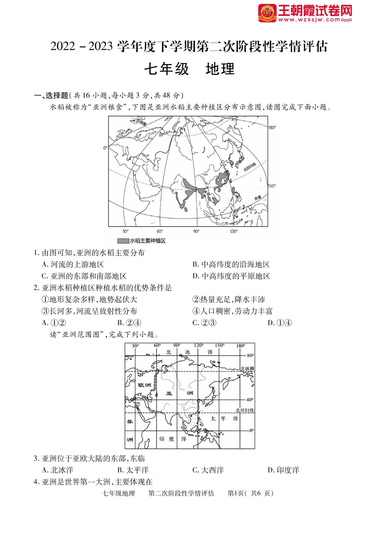 江西省九江市都昌县2022-2023学年度下学期第二次学情评估期末试题七年级地理(人教版)