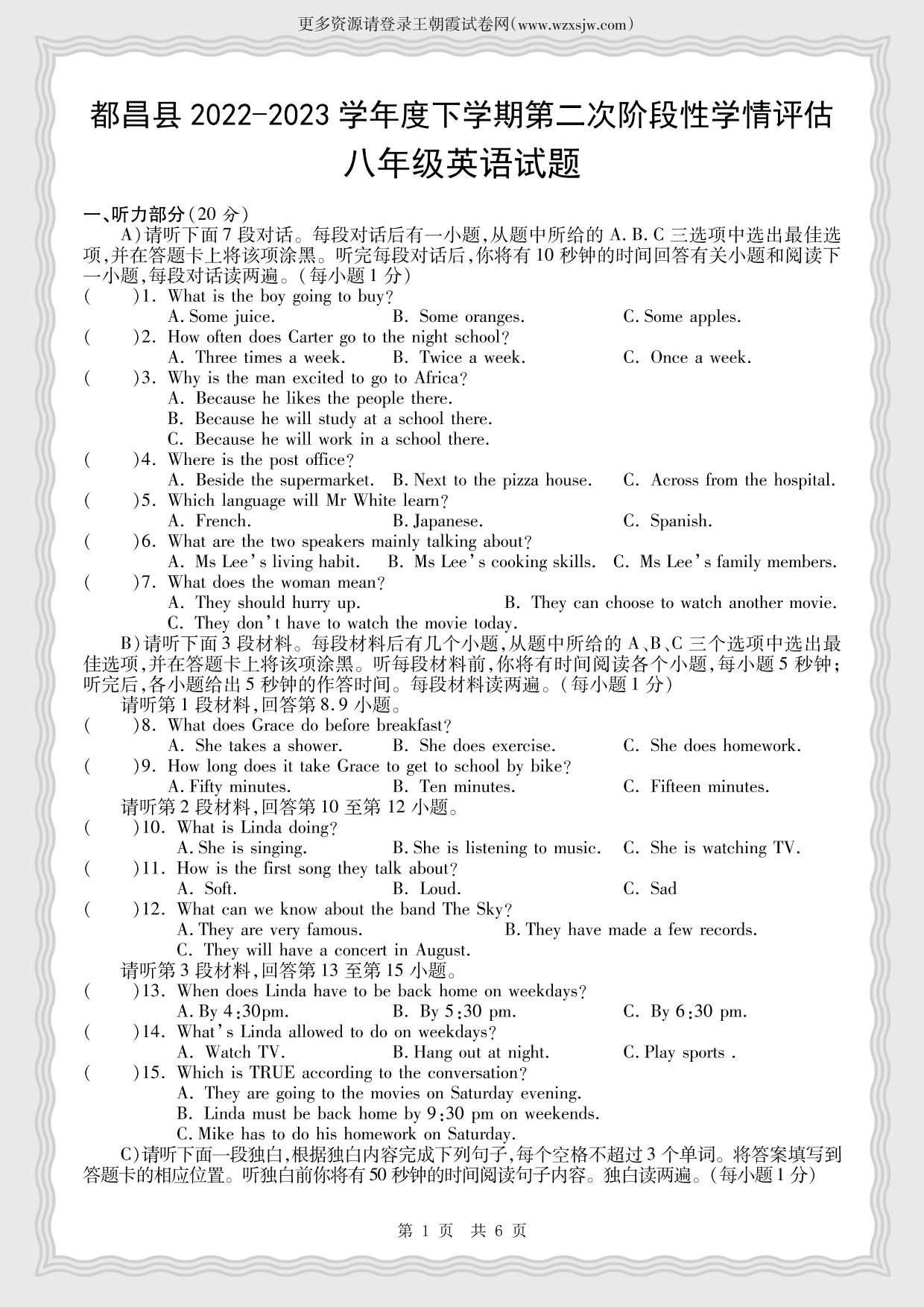 江西省九江市都昌县2022-2023学年度下学期第二次学情评估期末试题八年级英语【无听力音频】(人教版)